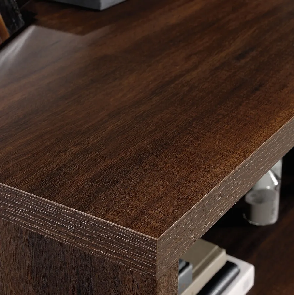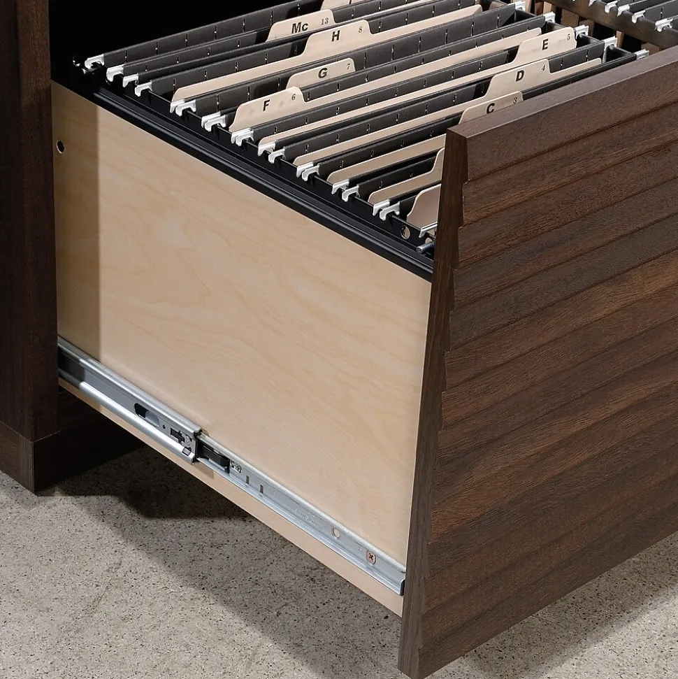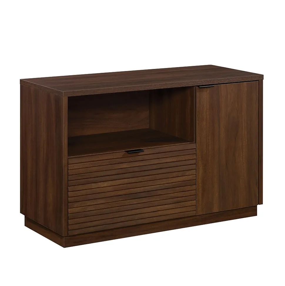 A file credenza must have a variety of storage space. And its a bonus when its super stylish too. This office storage cabinet from the Palo Alto collection catches the eye with vertical woodgrain and horizontal slatting. A durable 1″ thick top and end panels make the surface sturdy for a printer, lamp, books, plants, and more. The melamine top surface is heat, stain, and scratch resistant with impact resistant, high-grade thermoplastic edges. This office storage credenza features an adjustable shelf behind storage door to accommodate items of various heights. A spacious file drawer with full extension slides conveniently holds letter-size hanging files so all your documents are organized and easy to find in this resimercial credenza. Get to work as quick as possible with easy assembly featuring a T-lock drawer system. Finished in a Spiced Mahogany, this commercial office storage increases display space in a stylish way.