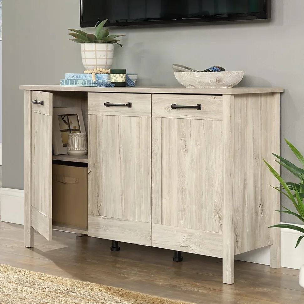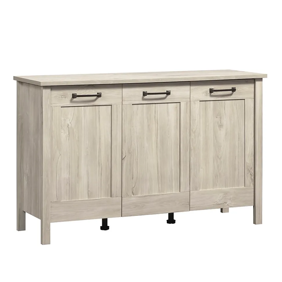 Boost your style while elevating your organization level with the Sauder Select 3-door storage cabinet. This sophisticated storage cabinet with doors seamlessly combines an elegant and classic aesthetic with ample storage solutions. Behind its three trendy, framed doors lie hidden compartments and adjustable shelves, offering versatile configurations for items of all sizes, including space for 12 x 12 storage bins (sold separately). From dinnerware, tablecloths and napkins to board games, books and puzzles, this 3-door console cabinet accommodates a diverse range of household necessities. The framed door fronts of this sideboard storage cabinet are adorned with visually appealing, dark, contrasting hardware. Crafted in a light and neutral finish, this console storage cabinet provides a spacious top surface for showcasing cherished family photos, a stylish lamp, or a selection of festive holiday decor. Finished in delicate Chalk Oak, this cabinet embodies both form and function for an exquisite storage solution.