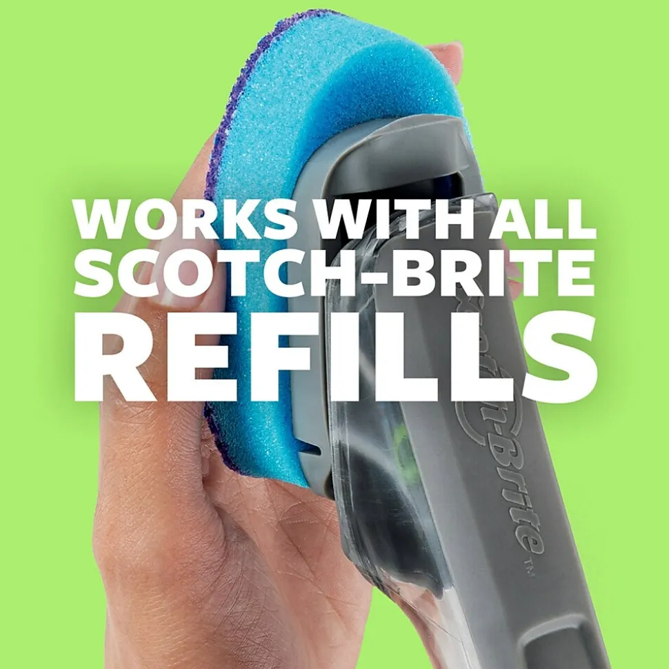 Keep your dishes clean and your hands out of the water with the Scotch-Brite Soap Control Non-Scratch Scrub Dots Dishwand, from America’s No. 1 selling dishwand brand. This long-lasting dish sponge with soap dispenser handle features 3x the scrubbing power* to take down everyday messes with ease. Offering precise soap control with the push of a button, this dish scrubber dispenses the right amount of dish soap exactly where and when you need it. Say goodbye to soap spills for good thanks to the leak-free guarantee and innovative valve that keeps dish soap from leaking, no matter how you store your scrub sponge wand. The soft-touch surface provides a non-slip grip, and the built-in scraper helps remove stuck-on foods. This non-scratch cleaning sponge is safe to use on dishes, non-stick cookware, countertops, tubs and showers, and more. Plus, it resists odors and rinses clean – even eggs and cheese won’t stick to this easy-to-clean kitchen sponge with handle. Just fill it with your favorite dish soap, and effortlessly wipe away grease and grime. The Scotch-Brite Soap Control Non-Scratch Scrub Dots Dishwand is durable, reusable and top shelf dishwasher safe, with scrubbing fibers made from 75% recycled content.