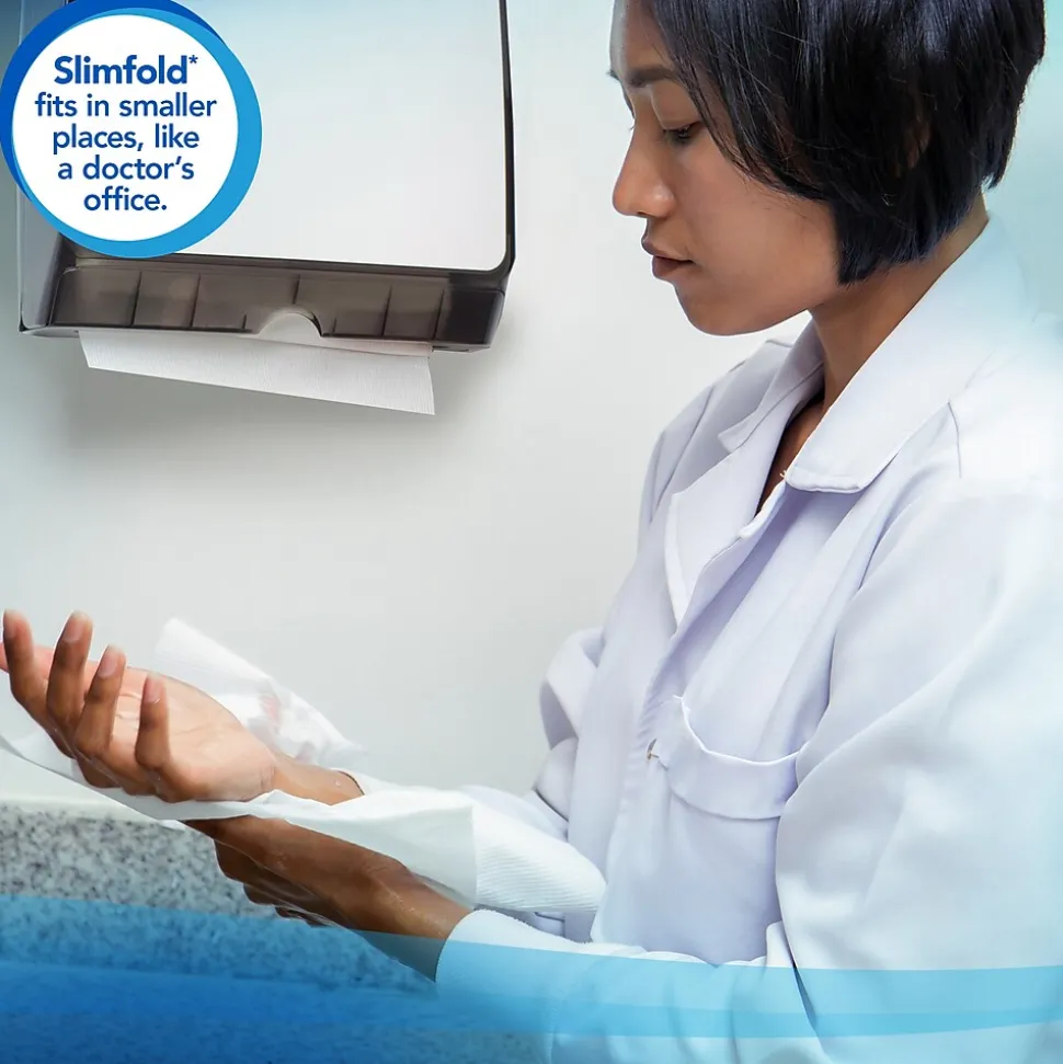 Wipe up messes or dry hands with these paper towels. The five-fold design conserves space on counters and tables and provides easy dispensing, while the built-in absorbency pockets soak up moisture to leave surfaces clean and dry. These paper towels are packaged in 90-sheet bundles, allowing for easy distribution throughout your building. With a crisp, white color, these Scott Control Plus+ Slimfold paper towels offer a clean look for use in offices, schools, and medical facilities.