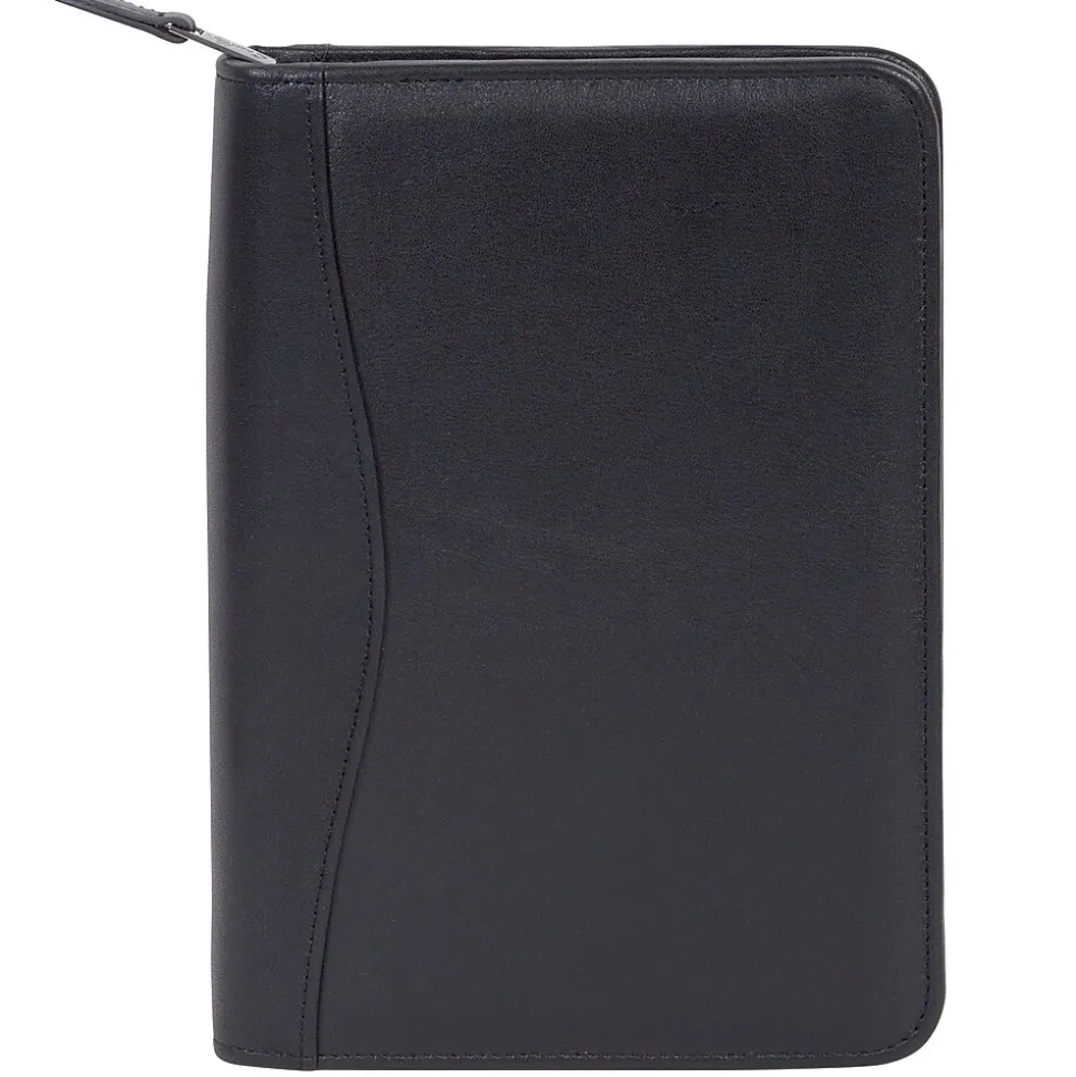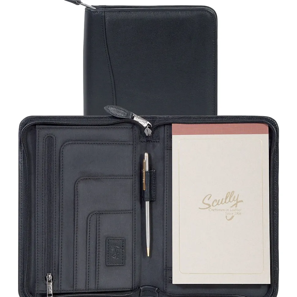 Genuine Soft Plonge Leather Junior Zip Padfolio – This junior zip deluxe padfolio is compact yet accommodates your files with a gusseted inside organizer with full zip pocket and open pockets. It has a 5” x 8” writing pad and Scully pen. Color: Black; Overall Item Size: 6.5”L X 9.5”H X 1”W.