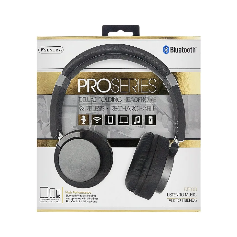 Produce high-quality sound with these wireless headphones. The 30-foot Bluetooth connectivity range delivers an extended coverage area so you can engage in different activities without distorted audio or a dropped connection. A rechargeable lithium-ion battery provides hours of listening time while on the go, and the aux cable helps you connect these headphones to a variety of devices. These Sentry Bluetooth headphones fold, letting you pack and carry them almost anywhere.