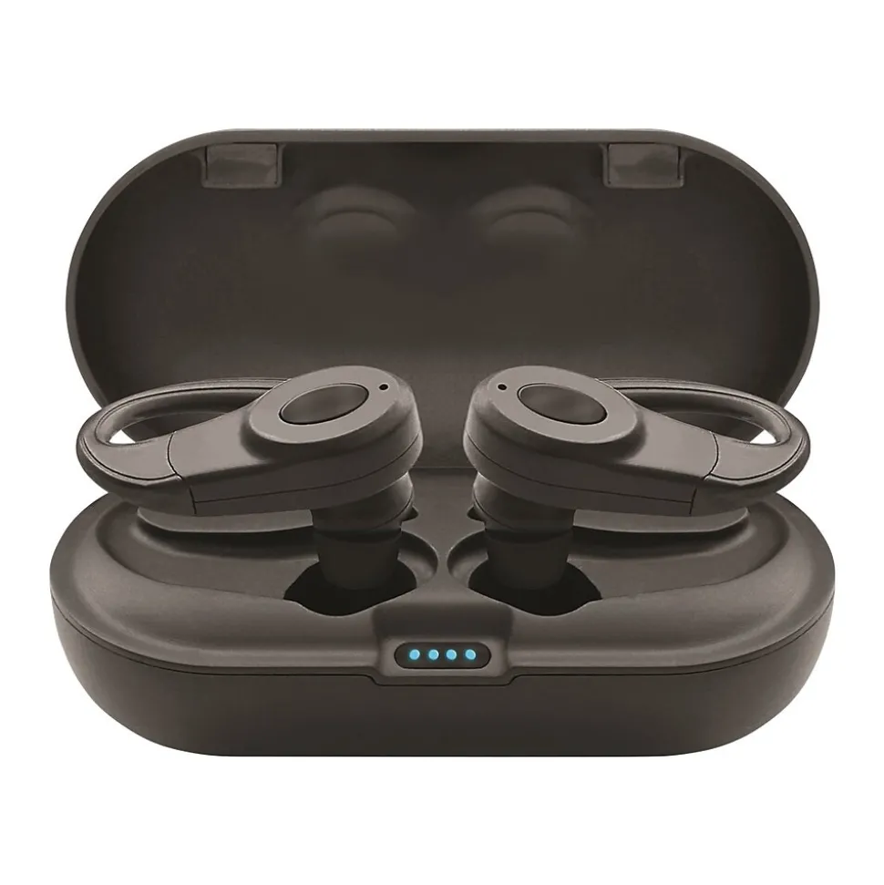 Experience the freedom of no wires. The lightweight earbuds will keep you connected throughout the day. Using the trusted Easy-Pair technology, you will be listening in no time. Sport these wrap-around style earbuds with sweatproof rubber finish. An included case boasts a long-lasting battery for those long days out in the wild.