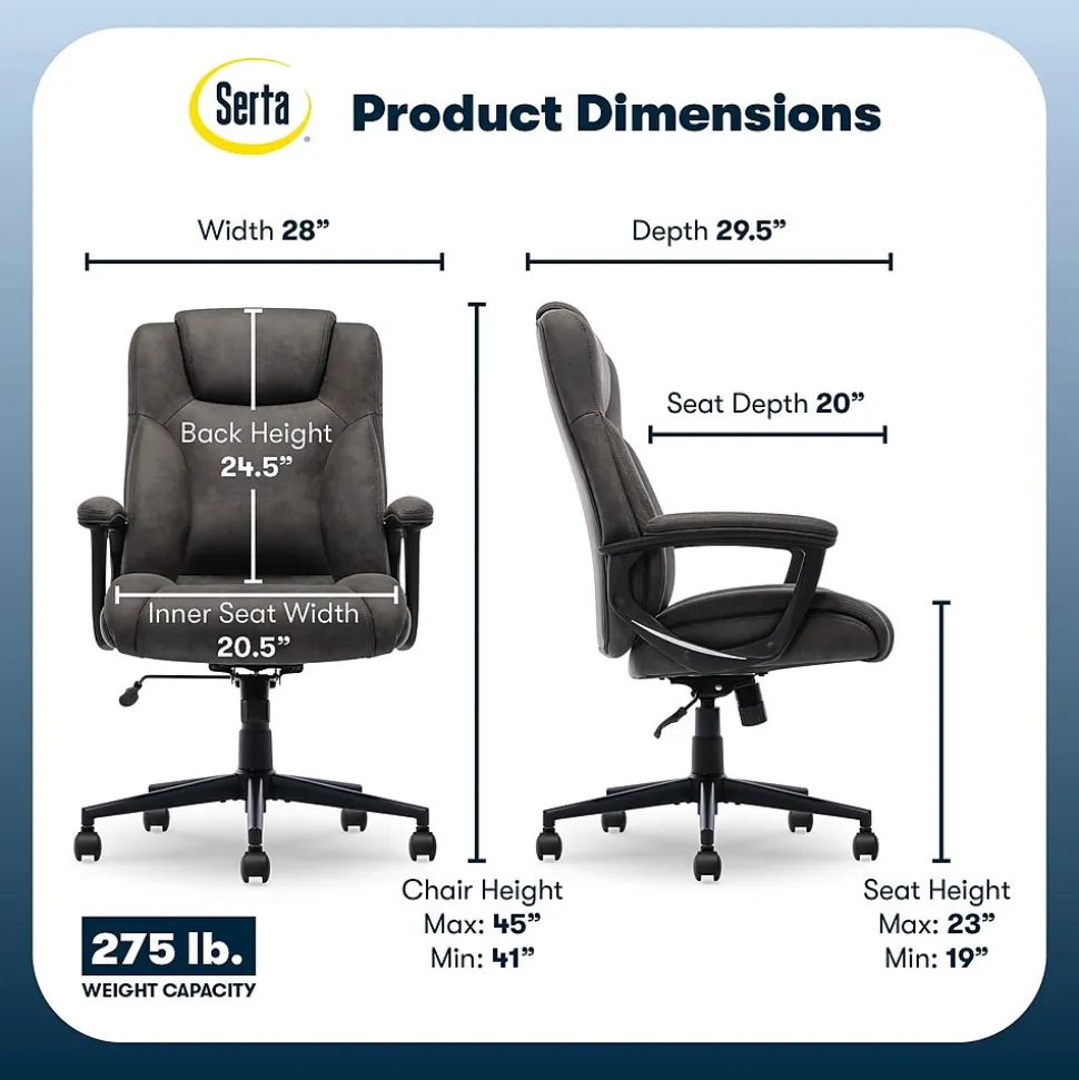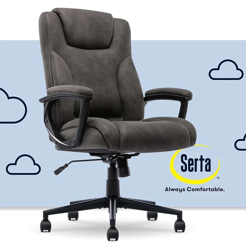The better you sit, the better you’ll feel. Whether for work, play, or any other activity that has you sitting in our chairs, we believe comfort is everything. We know it’s a big responsibility and take it seriously, just as we do with our mattresses. With over 15 years of making chairs and innovating with designs, materials, and technology, Serta knows what it takes to give you a comfortable sit. Crush your to-do list and conquer the workday with the Comfort Eco chair. This modern desk chair focuses on prioritizing your well-being without compromising on style. Its simple and sleek form, sculpted arms, and piped edges with tailored double-stitching bring a sophisticated style fit for any executive workspace. Mindful of the way your body sits and moves, the ergonomic mid-back adapts to your posture with gentle contours that conform to your natural spinal curves. The lumbar support also takes the strain off your lower back and encourages you to sit without slouching. Sitting at your desk all day is easier with padded body pillows in the backrest that relieve tension and pressure. The waterfall edge seat keeps you comfortable with layered contours and a semi-plush cushion that’s stuffed with high-density foam. Covered in luxuriously soft velvet with 4 neutral colors in Brown, Black, Light Gray, and Light Brown, find the right shade to complement your decor. The 360° swivel base on double-wheel casters glides smoothly across carpets or rugs, and can handle up to 275 lbs. Finding your ideal seated position is a breeze with the one-touch side lever for convenient height adjustment and tilt-lock to match your work set-up. The Serta Comfort Eco chair will be a welcoming work companion for the busy body in the office or at home. Whether you’re answering emails, hopping on video calls, or diving deep into your work, this reliable chair will provide the comfort and support you need to stay productive.