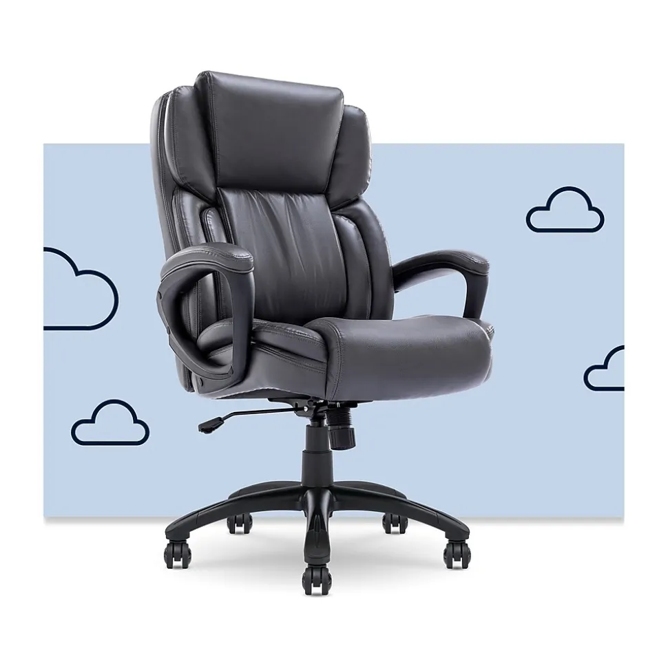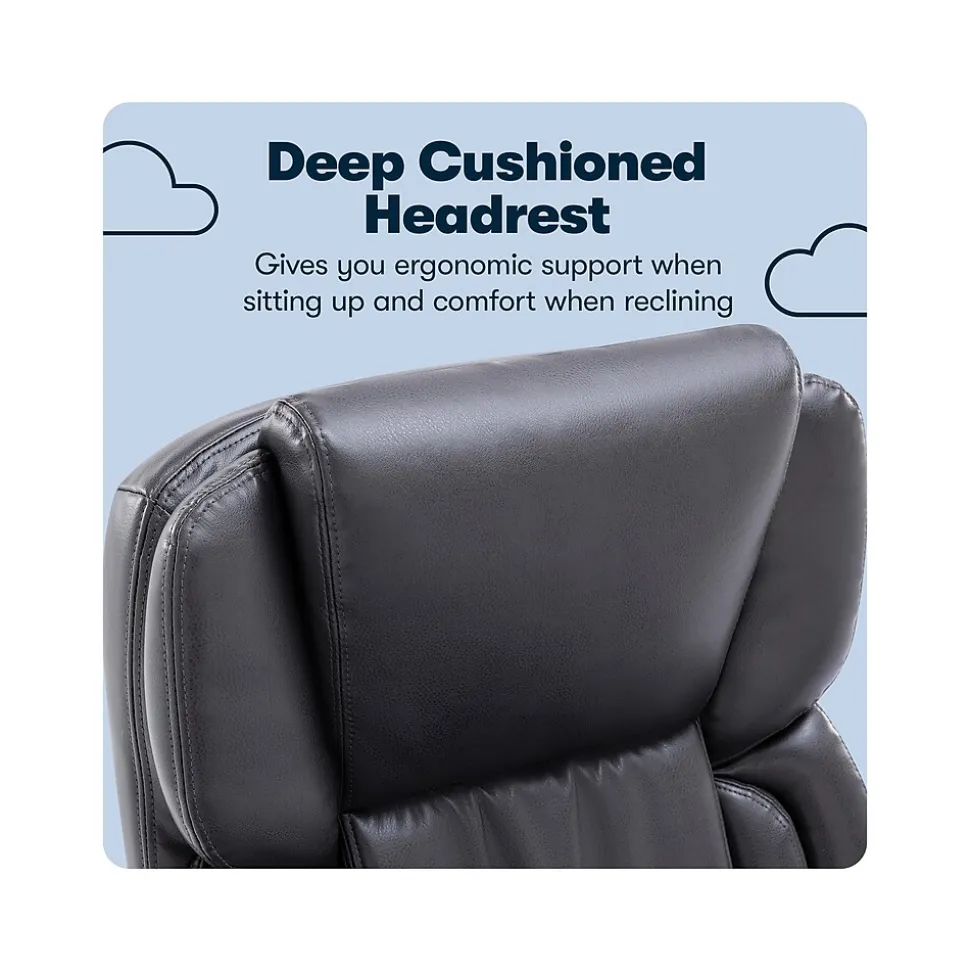 Bring relaxation to your busy workday with the Serta Garret executive office chair. Serta kept comfort in mind while designing this desk chair, with luxurious layered body pillows, a contoured lumbar zone, and padded armrests for all-day ease and exceptional support during long periods of sitting. The waterfall seat edge reduces pressure on the back of the legs and increases circulation, which helps decrease fatigue while seated. The ergonomic office chair features both recline and seat height adjustment settings, allowing you to find your optimal seating position. This desk chair is upholstered in supple bonded leather with contrast stitching for comfort and style in any workspace.