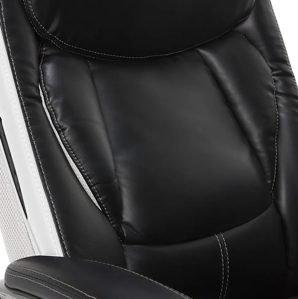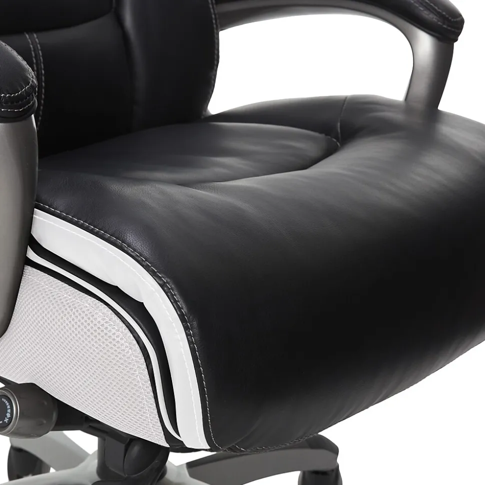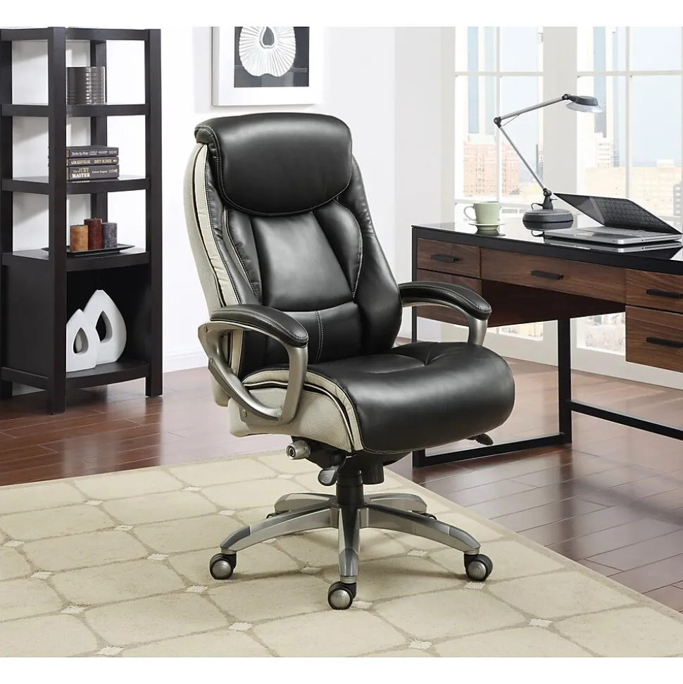 Find a reason to relax during your workday with this executive office chair from Serta, a brand known for quality and comfort. This ergonomic desk chair has layered body pillows and a pillowed headrest to provide ease while seated for long periods of time. The hand-sculpted arms and smooth bonded leather upholstery have a sleek, professional look that stands out in any work environment. Fully adjustable, this executive office chair allows the user to customize the height and lumbar zone for optimal comfort. This desk chair has a five-layer cushioning system for all day comfort and support.