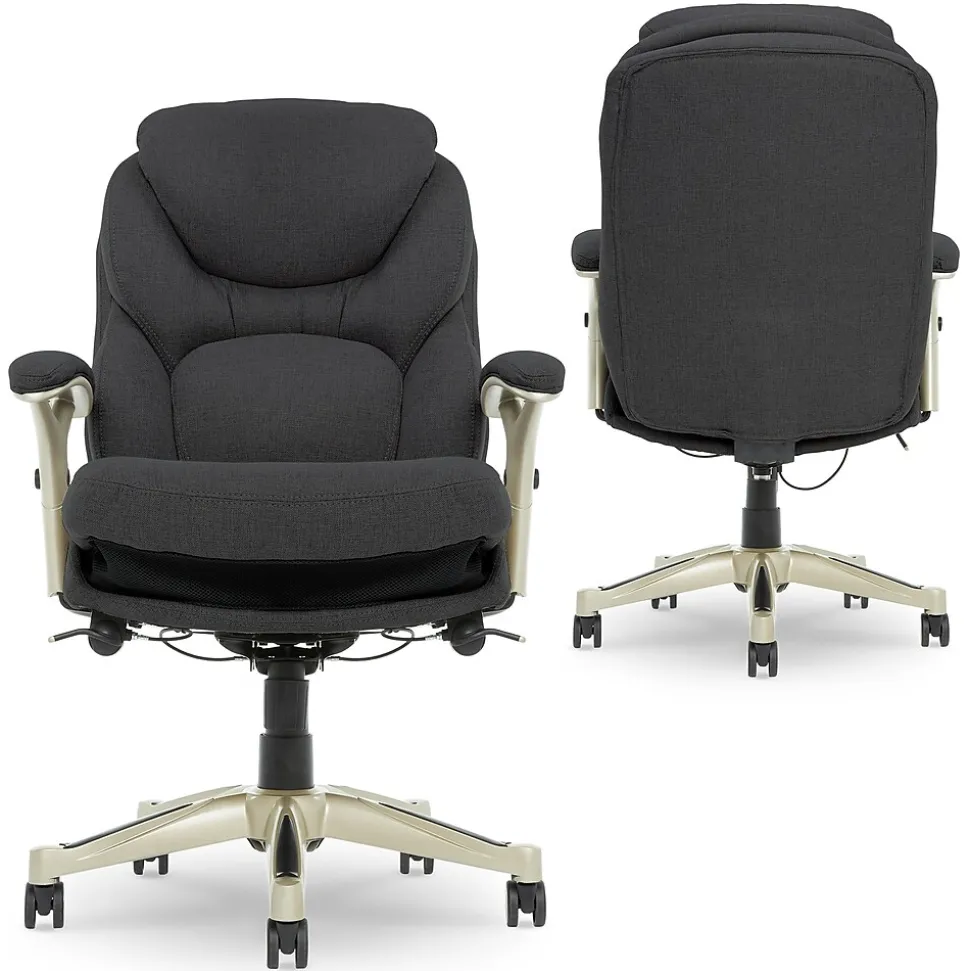 Imagine an office chair that helps promote strength and flexibility in your back. That’s the Serta Works ergonomic executive office chair with Back in Motion technology. This feature-rich, performance-focused chair helps its users become more productive and efficient by maximizing lower back support and comfort while seated. The Back in Motion active seat technology swivels the lumbar forward like the pelvis tilt exercise, promoting strength and flexibility in your core. The push-button adjustable armrests and pneumatic height adjustment can be customized to find the right fit for you. And the multilayered cushions are comfortable yet supportive, so you’ll feel refreshed and rejuvenated, even after a long day.