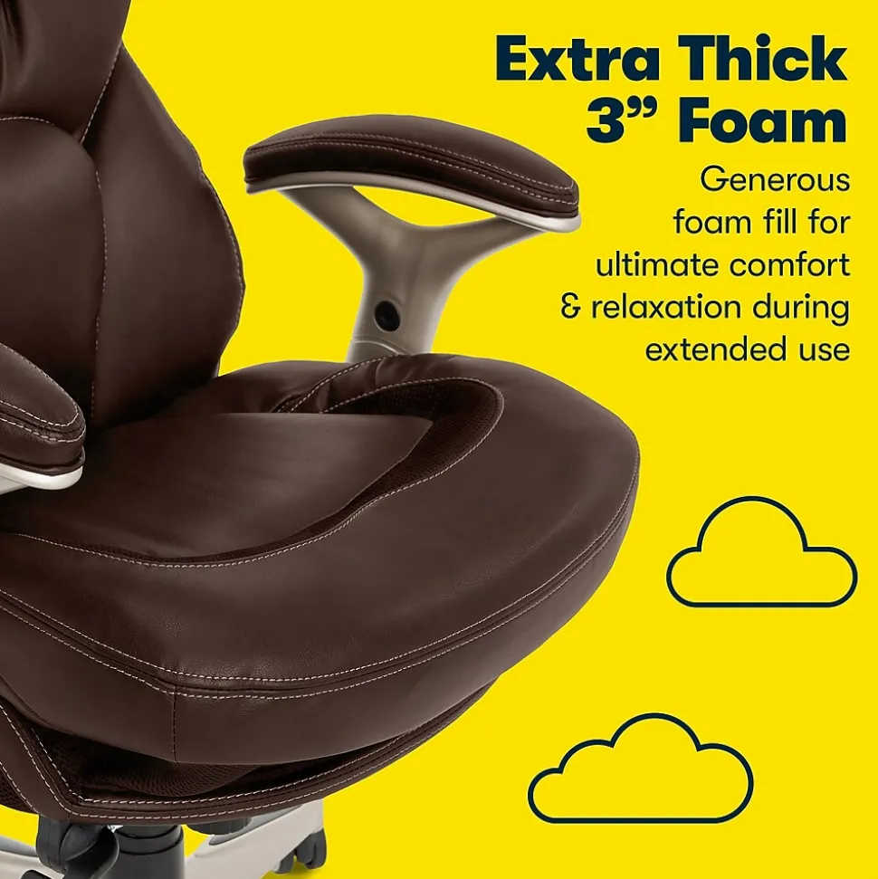 Imagine an office chair that helps promote strength and flexibility in your back. That’s the Serta Works ergonomic executive office chair with Back in Motion technology. This feature-rich, performance-focused chair helps its users become more productive and efficient by maximizing lower back support and comfort while seated. The Back in Motion active seat technology swivels the lumbar forward like the pelvis tilt exercise, promoting strength and flexibility in your core. The push-button adjustable armrests and pneumatic height adjustment can be customized to find the right fit for you. And the multilayered cushions are comfortable yet supportive, so you’ll feel refreshed and rejuvenated, even after a long day.
