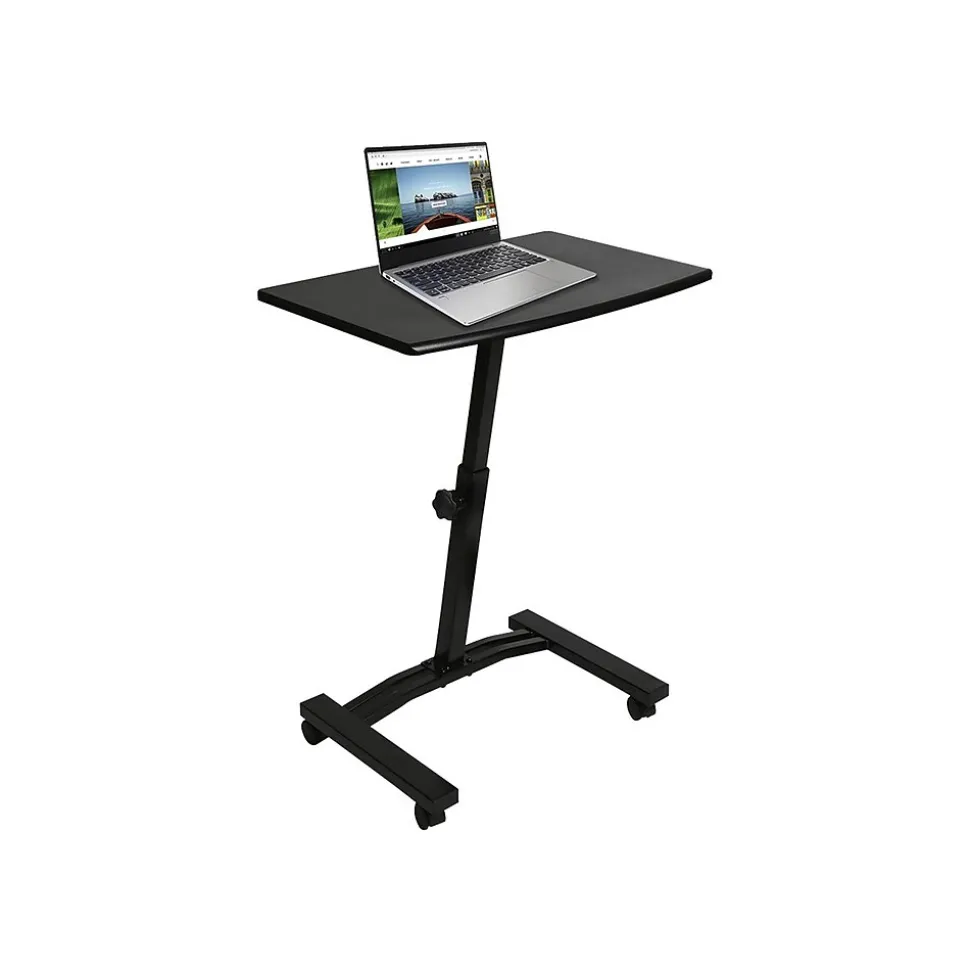 Work the way you want with this Seville Classics mobile laptop/computer desk cart. Designed with mobility in mind, the cart features four smooth-gliding, 1.5″ casters so you can take your work with you; two locks allow the desk to stay where you leave it. Easily move your laptop or writing workstation to any space in your home, dorm, or office. Manually adjust the desk’s height and keep it there with the locking knob. The desk features a steel frame for stability, durability, and strength. The base is a low-profile design intended for use with or without casters, so it can be moved close to furniture like couches and recliners.