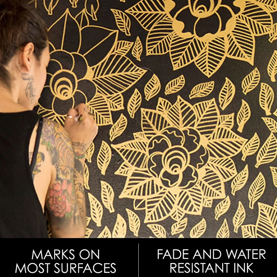 Leave glimmering marks on labels or brilliantly colored artwork with this 3-count pack of Sharpie metallic markers. The opaque permanent ink leaves a bright sheen on light or dark surfaces, and the ink is fade- and water-resistant for use on indoor or outdoor projects. The fine tip of these Sharpie metallic markers lets you create bold lines or precise writing and drawing.