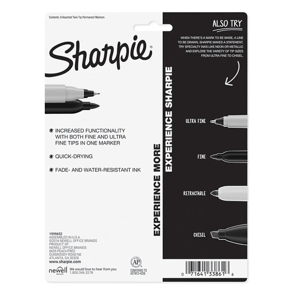 Embellish your presentations and writing with these Sharpie Twin Tip assorted-color permanent markers. The pens come in eight assorted colors, so you can create dynamic works of art, and they work on virtually any hard surface, including metal, glass, wood, fabric, and paper. These Sharpie Twin Tip permanent markers have both fine and ultra-fine tips, making them ideal for projects requiring lots of fine details.