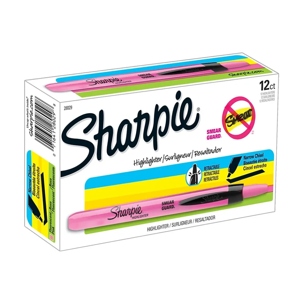 Create vibrant fluorescent pink markings with these retractable highlighters. Versatile chisel tips let you go between thin and thick lines, so you can highlight and underline important text. These Sharpie highlighters feature smear free ink that resists smudging, and the retractable Safety Seal design keeps ink fresh.