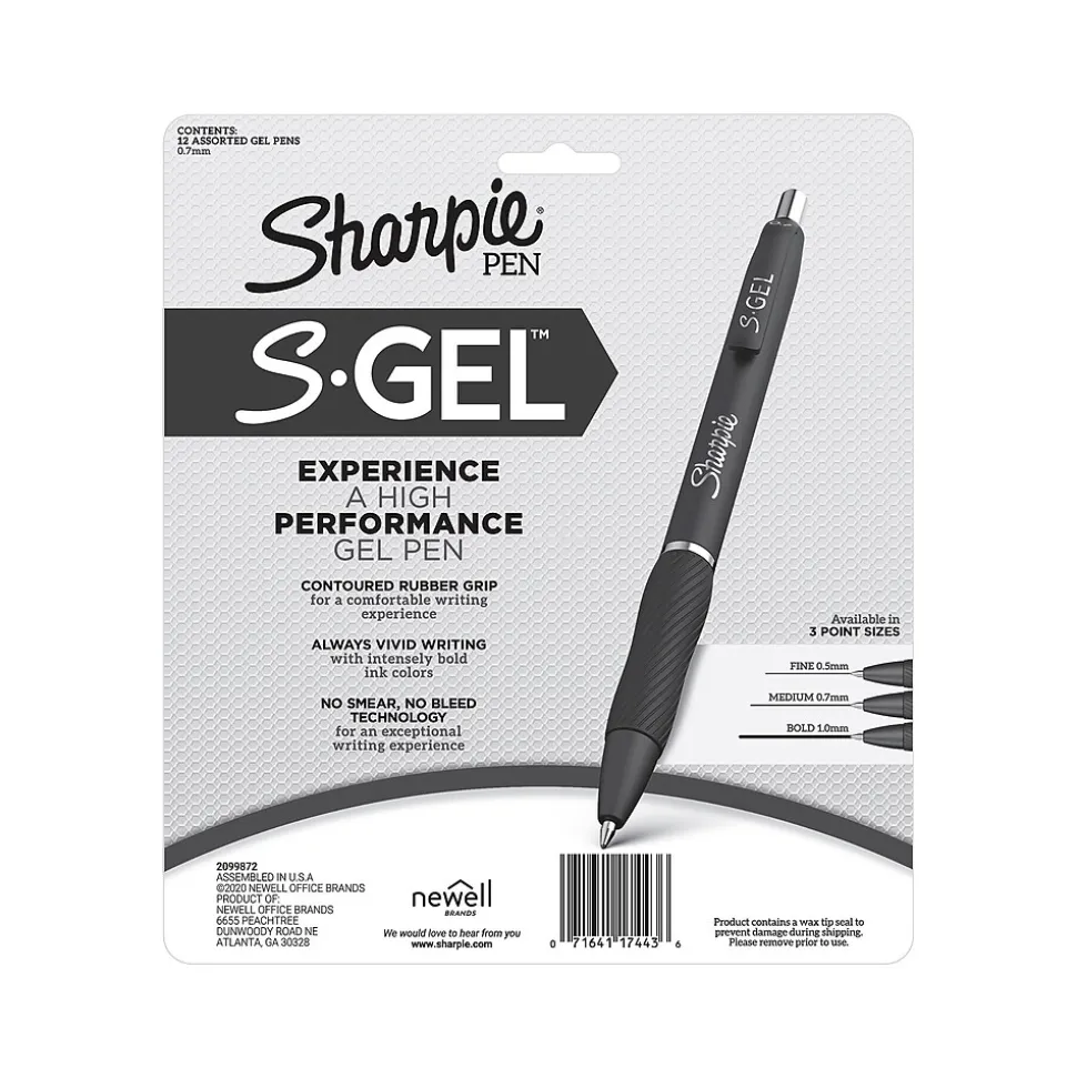 The power of Sharpie is now in a gel pen with the Sharpie S-Gel. With no-smear, no-bleed technology and bold ink, this Sharpie pen delivers always-vivid writing. It’s a high-performance gel pen with a sleek, professional look that makes it a writing instrument you won’t want to loan out. And the contoured rubber grip makes for comfortable writing during any task. Sharpie S-Gel offers a smooth writing experience perfect for homes, schools, or offices.