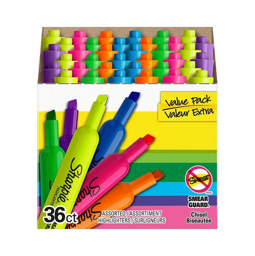 Enjoy reliable, long-lasting marking with Sharpie tank highlighters. Featuring a wide barrel, large ink supply, and chisel tip, these highlighters deliver dependable and accurate marks. They also have SmearGuard ink technology that resists smearing (let ink dry before highlighting).