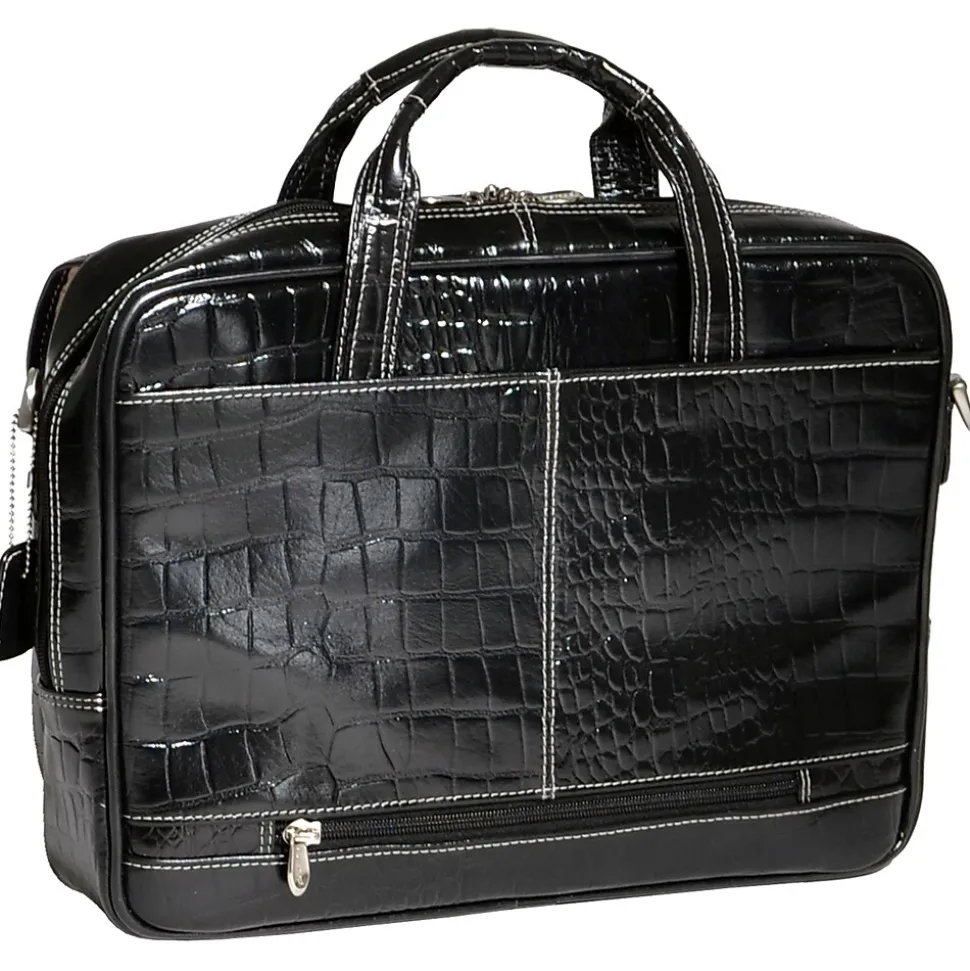 Briefcase features quick, accessible front pocket with clasp and two small accessory pockets.