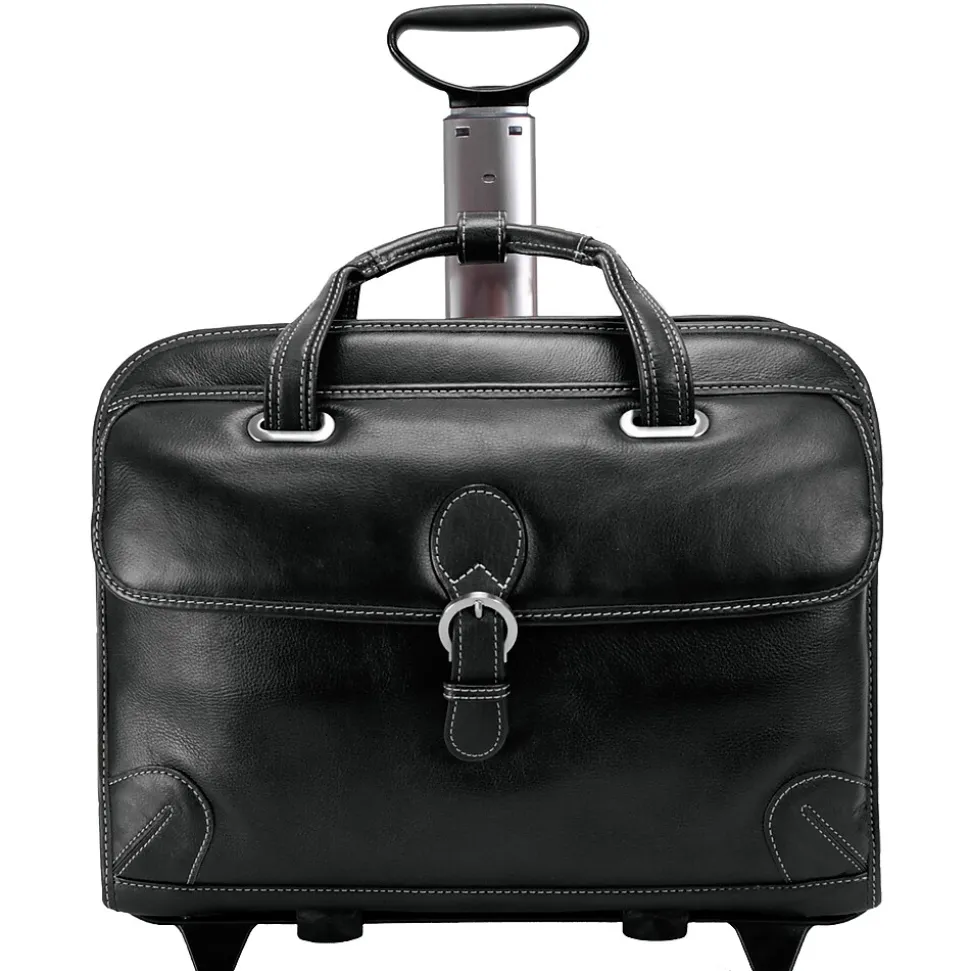 Patented 2-in-1 Removable Wheel and Handle System briefcase with quick, accessible front pocket with a magnetic clasp for files and accessories.