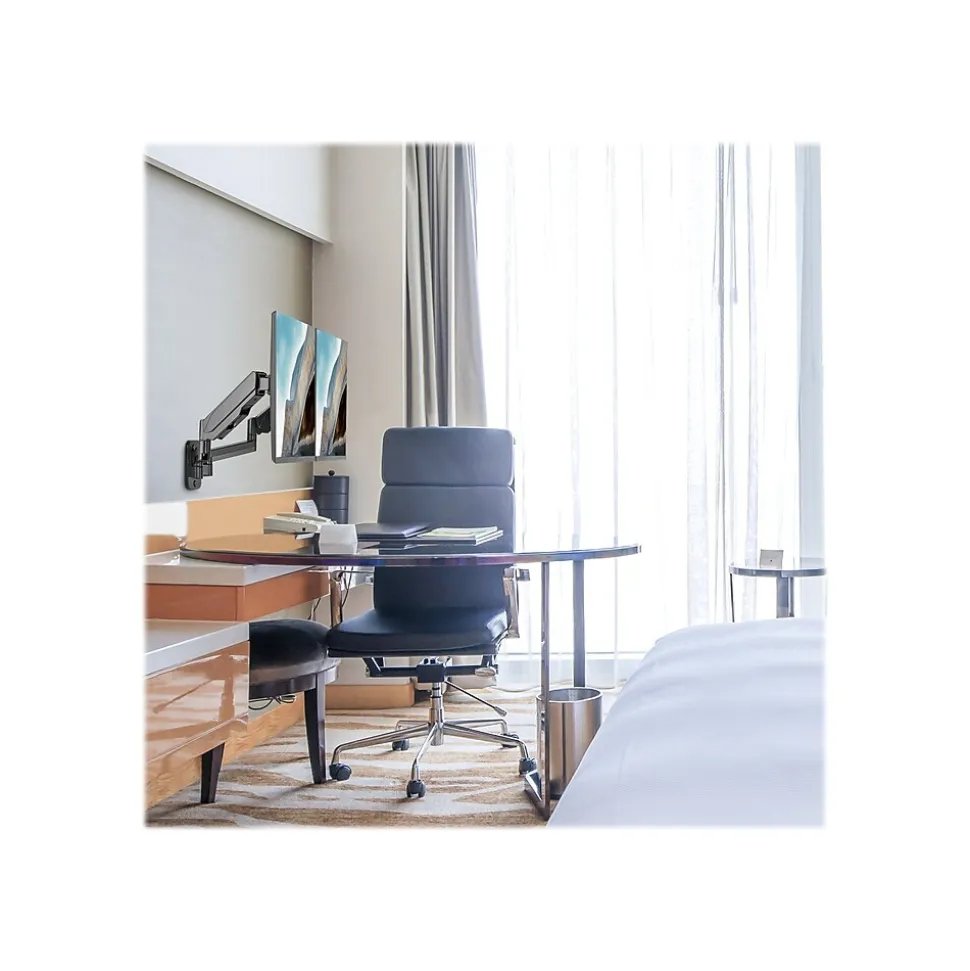 Premium quality durable gas spring assisted full-motion articulating dual monitor wall mount provides smooth, precise and effortless viewing height adjustment up to 11.02 inches. Rotating VESA plate supports portrait or landscape monitor orientation. Detachable VESA plate provides for easy monitor installation and adjustment. Compliant with VESA standard mounting hole pattern 75x75mm and 100x100mm to fit most 17″ to 32″ flat and curved monitors. Ergonomic enhanced features, include height adjustment, 180° arm swivel, monitor tilt angles of +/- 35° (up/down), and 180° (left/right) pan angle, provide unlimited viewing angle positions for optimal viewing comfort. Adjustable tension gas spring movement accommodates different weight loads to ensure smooth height adjustment, holds monitor weighing up to 17.6 lbs (8kg). Each monitor arm can extend up to 16.61 inches from the wall, great for areas with severe space constraints. Integrated cable management system keeps cables neat, organized, and out of the way for a clean clutter-free desktop. Designed for single wood stud mounting fits perfectly into limited wall spaces for convenient and easy installation.