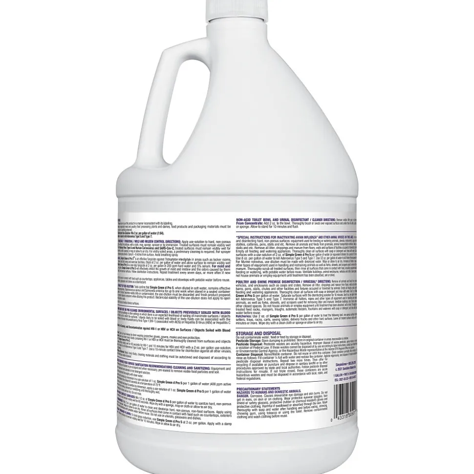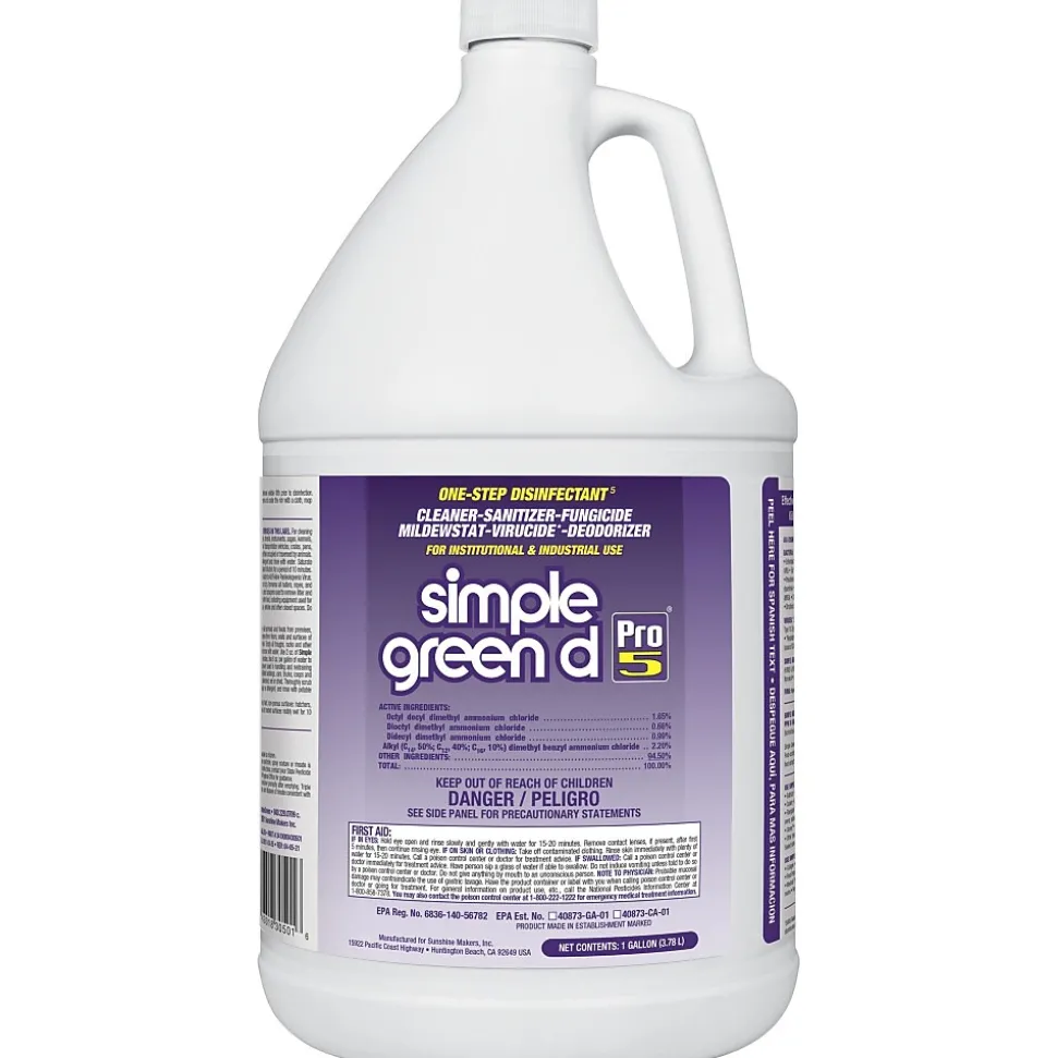 Make large cleaning tasks easier with this gallon of one-step unscented disinfectant. The specially formulated solution prevents growth of mold and mildew and kills germs, leaving surfaces clean and sanitary, and it can be used on just about any hard, non-porous surface effectively. This Simple Green d Pro 5 one-step disinfectant has no added perfumes, making it ideal for use in restaurants or hospitals.