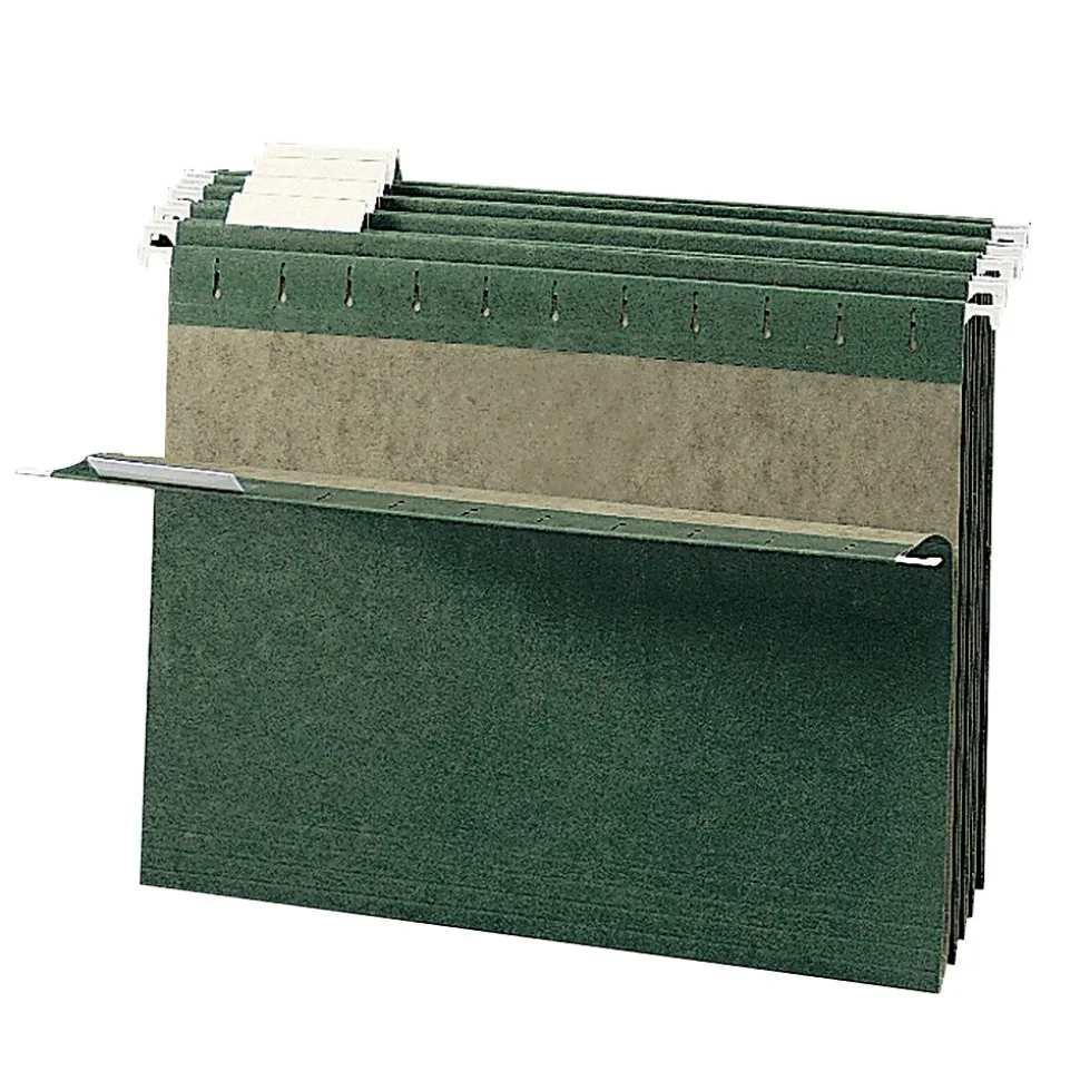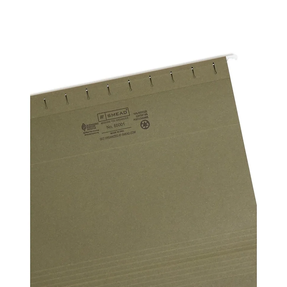 Organize documents with these hanging file folders. These folders feature special strips on their edges to guard against tearing. The interiors of these folders have a lighter color than their exteriors, which helps prevent documents from being misfiled. Each box of Smead reinforced hanging file folders comes with a label sheet and tabs to help users separate their items.
