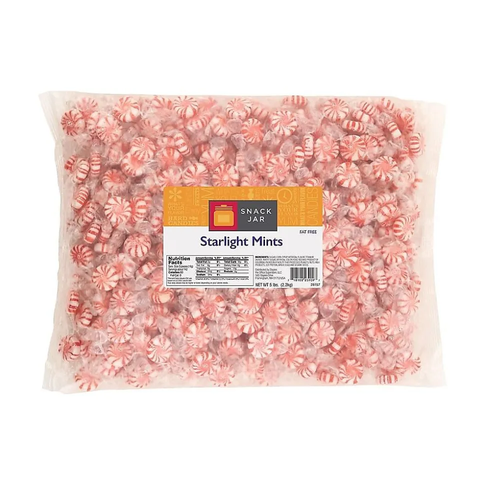 Fill your candy jars and bowls with a classic favorite when you stock up on these Snack Jar Starlight mints. Each piece comes individually wrapped for convenient sharing, and the fat-free recipes offer a guilt-free snacking option. With approximately 425 pieces in each 5-pound bag, these Snack Jar Starlight mints provide more than enough for the whole office to enjoy.