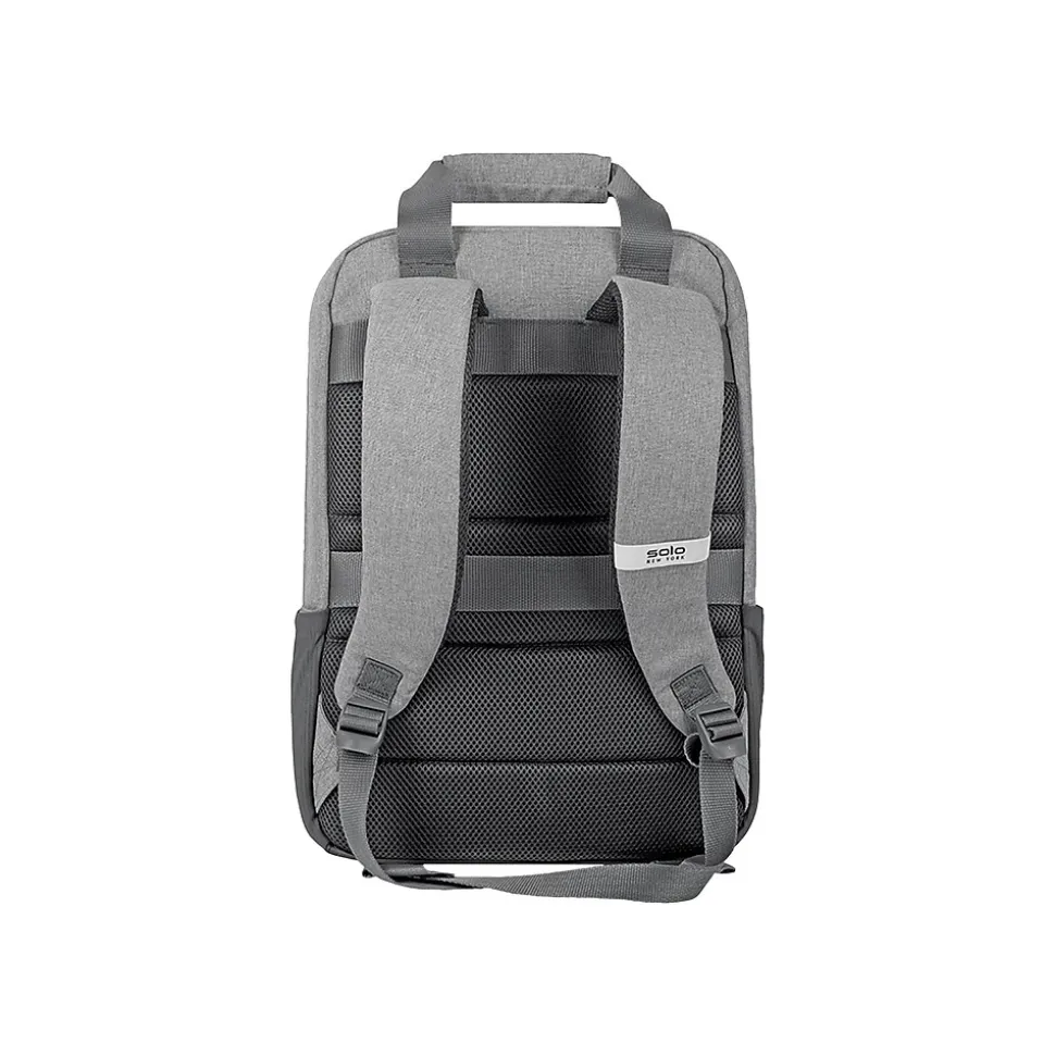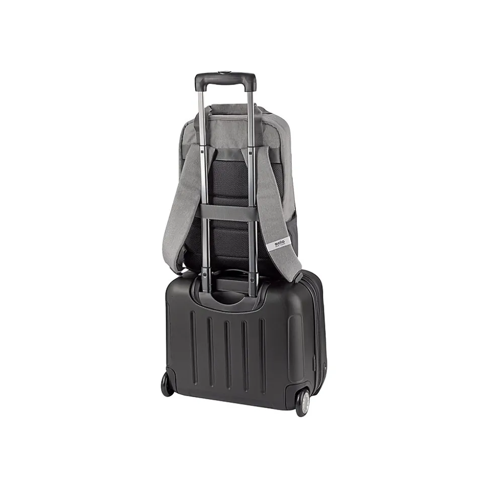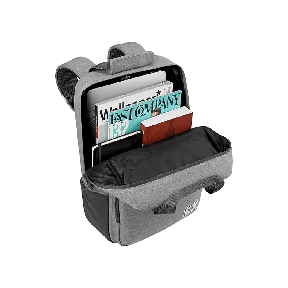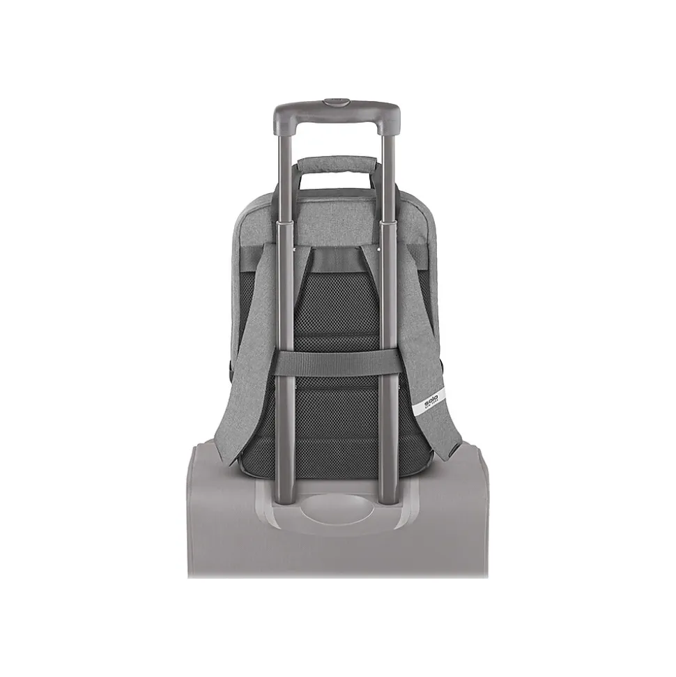 Solo New York is tackling environmental issues from all angles, in style. Designed in urban-cool gray, the Cycle collection brings a sustainable angle to sleek design, making green choices accessible to the masses. Each item in this collection is built with city-functionality in mind and offers an uncompromising style. Made from recycled PET bottles, this briefcase converts into a backpack; Padded mesh 15.6 inch laptop compartment, front zippered pocket, back strap slides over luggage handles.