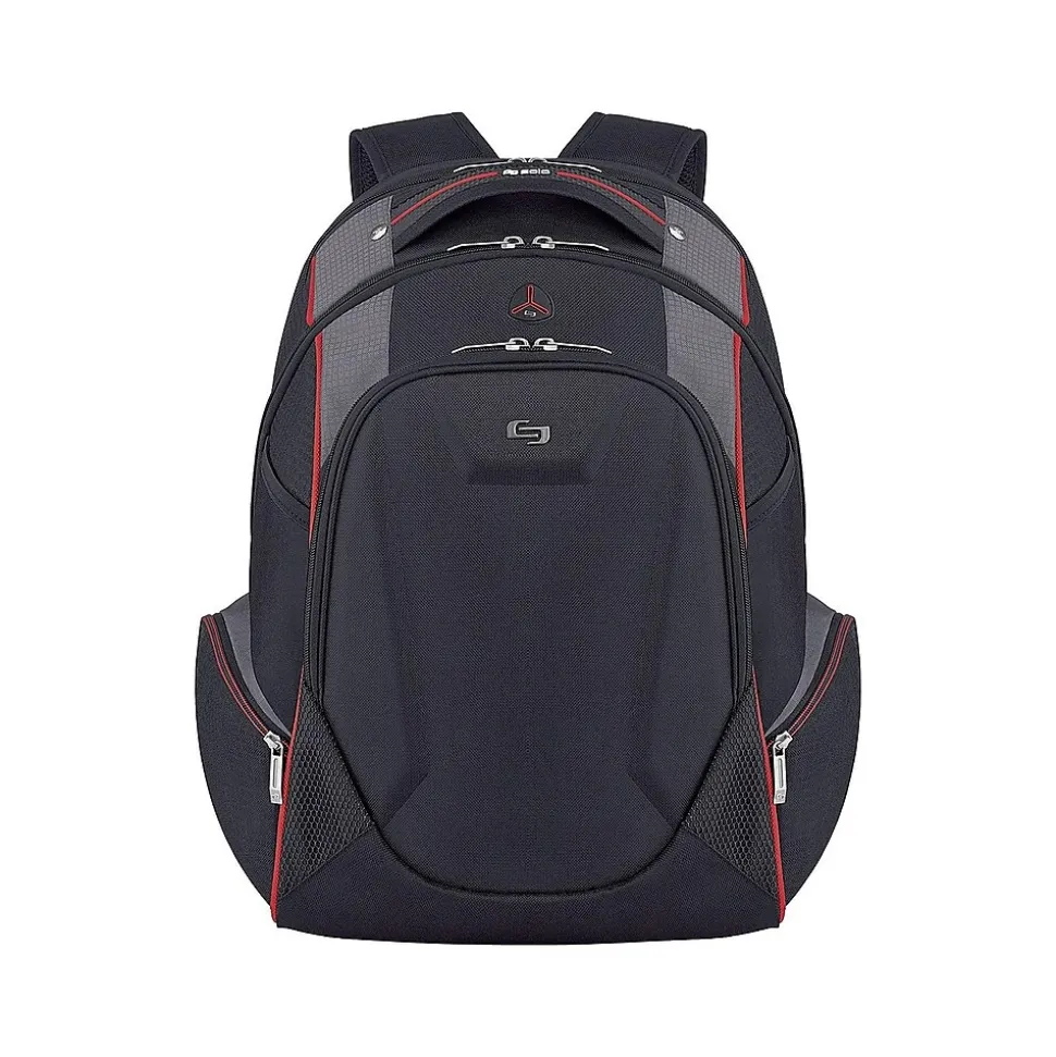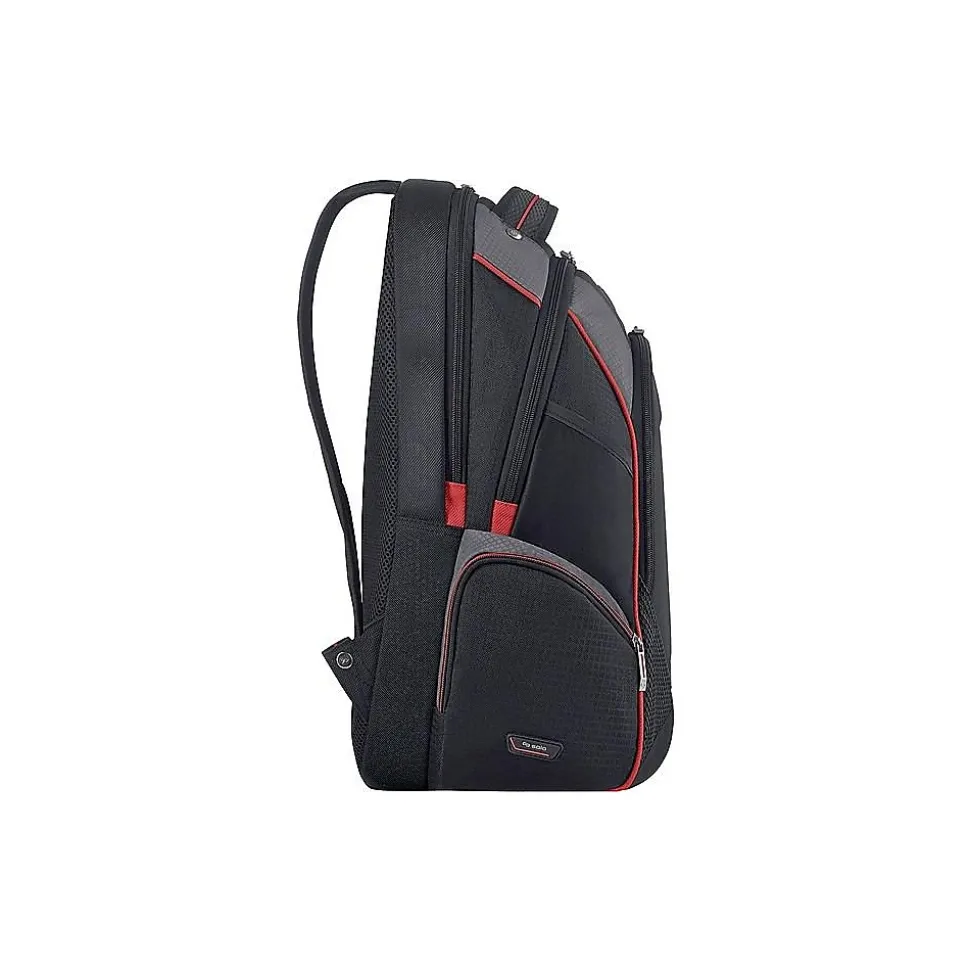 Give your personal electronics durable protection when you pack them inside this black and red backpack. A fully padded 17.3-inch laptop compartment shields your device against accidental bumps, while the dedicated pocket offers a perfect place to stash your tablet. A handy headphone port makes it easy to stay connected during phone calls or listen to favorite playlists. This laptop boasts zippered side pockets to accommodate small items or water bottles. The hardshell zip-down organizer keeps smartphones and other small devices safe from damage. Featuring a padded back and cushioned straps, this Solo New York Force Launch backpack provides added comfort as you journey to and from school or work each day.