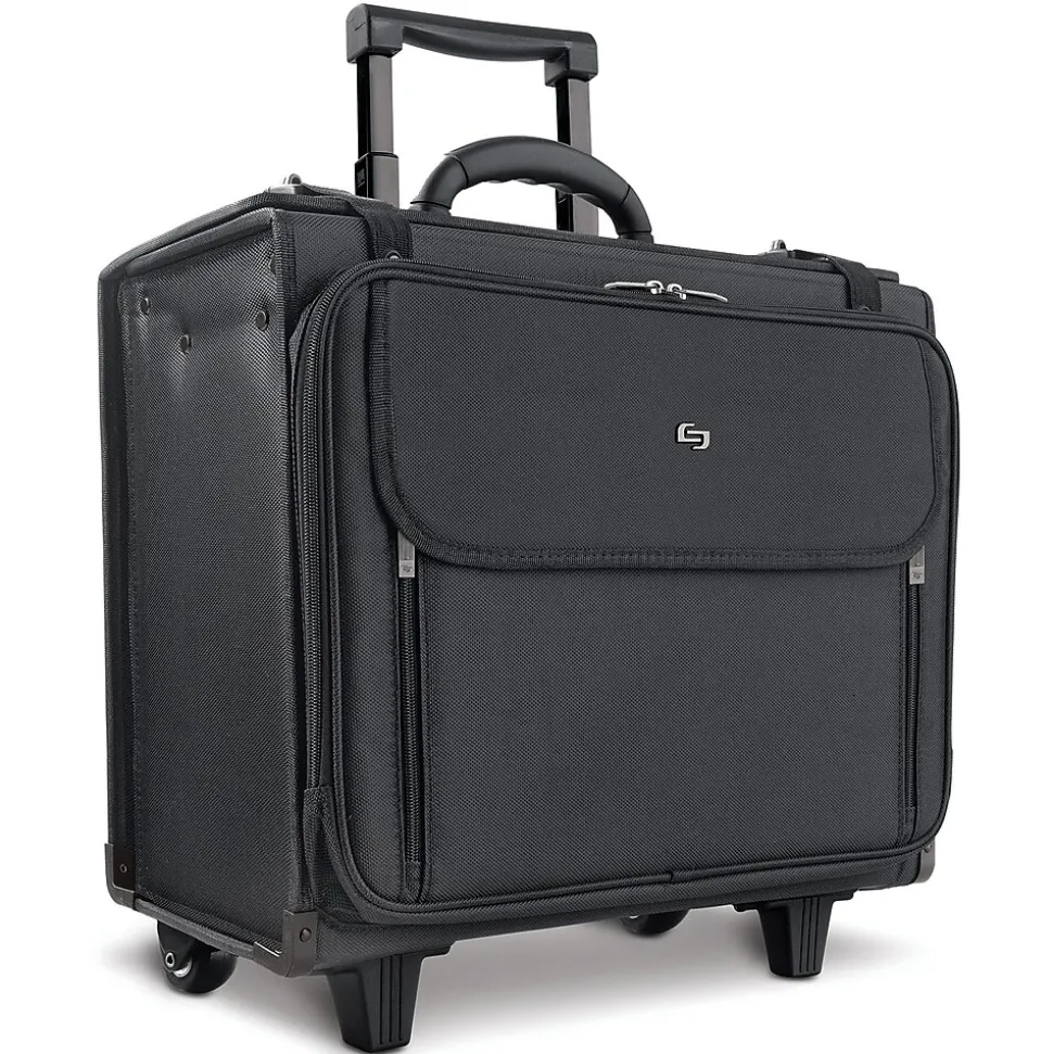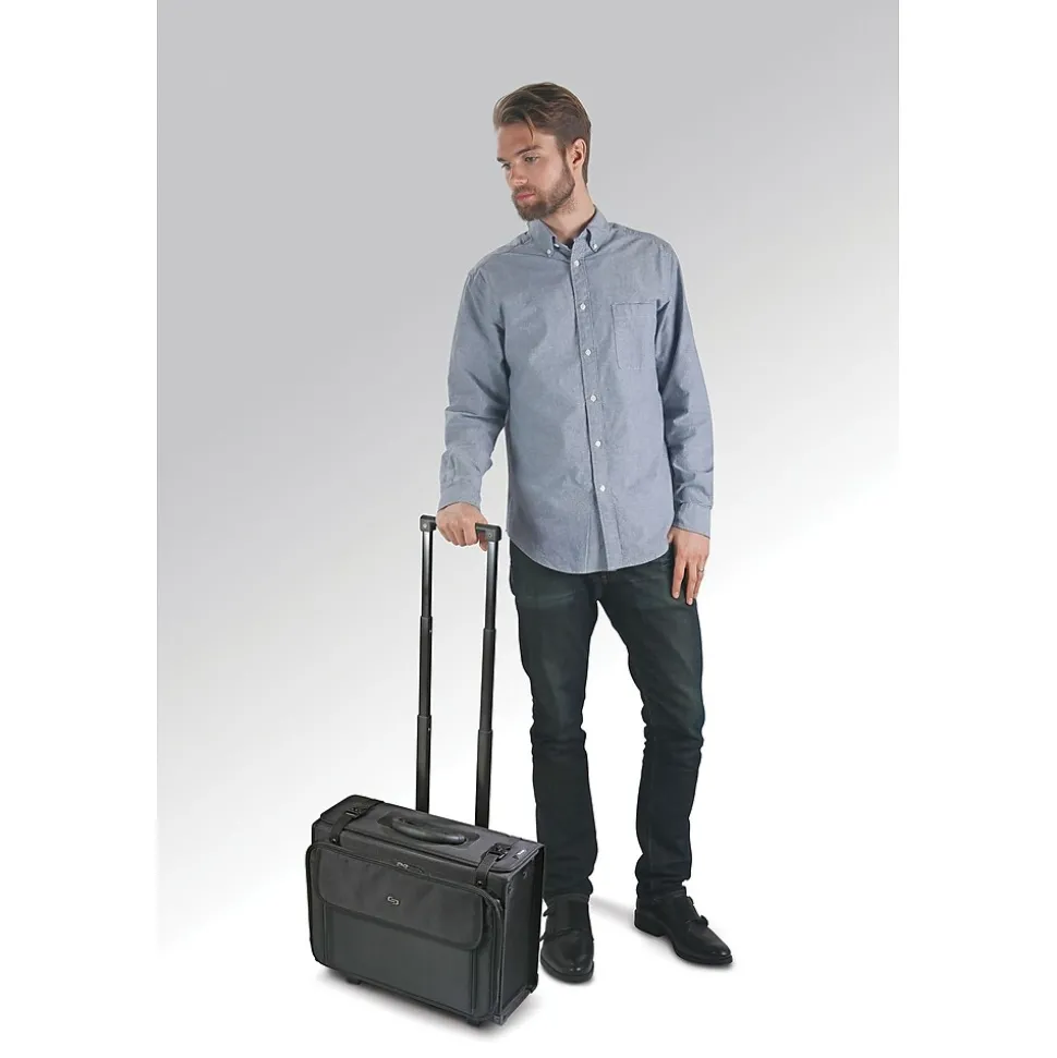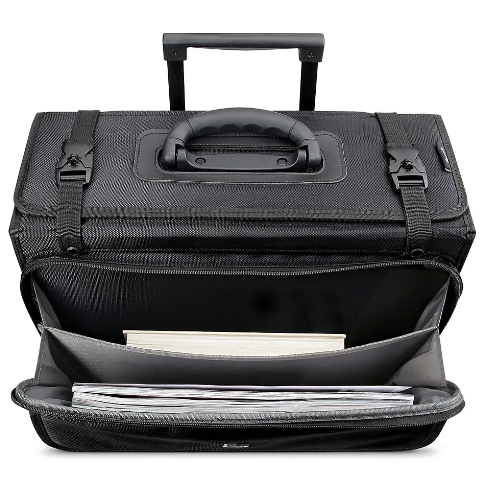 Keep work items organized and safely tucked inside this rolling catalog case. A hanging file system lets you quickly find important documents, while the removable laptop sleeve protects your device from damage while in transit. The front zip-down compartment offers space for small office supplies, keeping items easily accessible. This Solo New York Midtown Collection Morgan rolling briefcase features a telescoping handle system for effortless maneuvering down hallways and around corners.