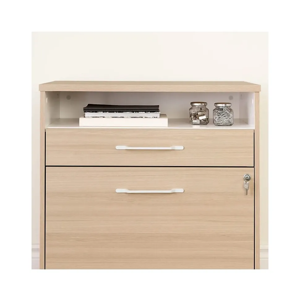 Need more room for storage in your work space? Then, the South Shore Helsy lateral file cabinet is a must-have. The surface is just the right size for a printer, which frees up space on your desk. The small open space can hold your printer paper or books, so they’ll be accessible and close at hand. The upper drawer can be used to hold little items, such as binders, pens, pencils, clips, etc. The final attribute: this unit has a file drawer that locks with a key. Perfect for organizing your most confidential documents and contracts.