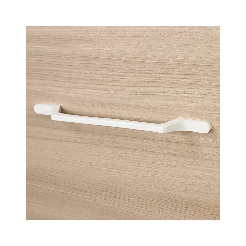 - Made of laminated particleboard in soft elm and white finishes with white hardware
