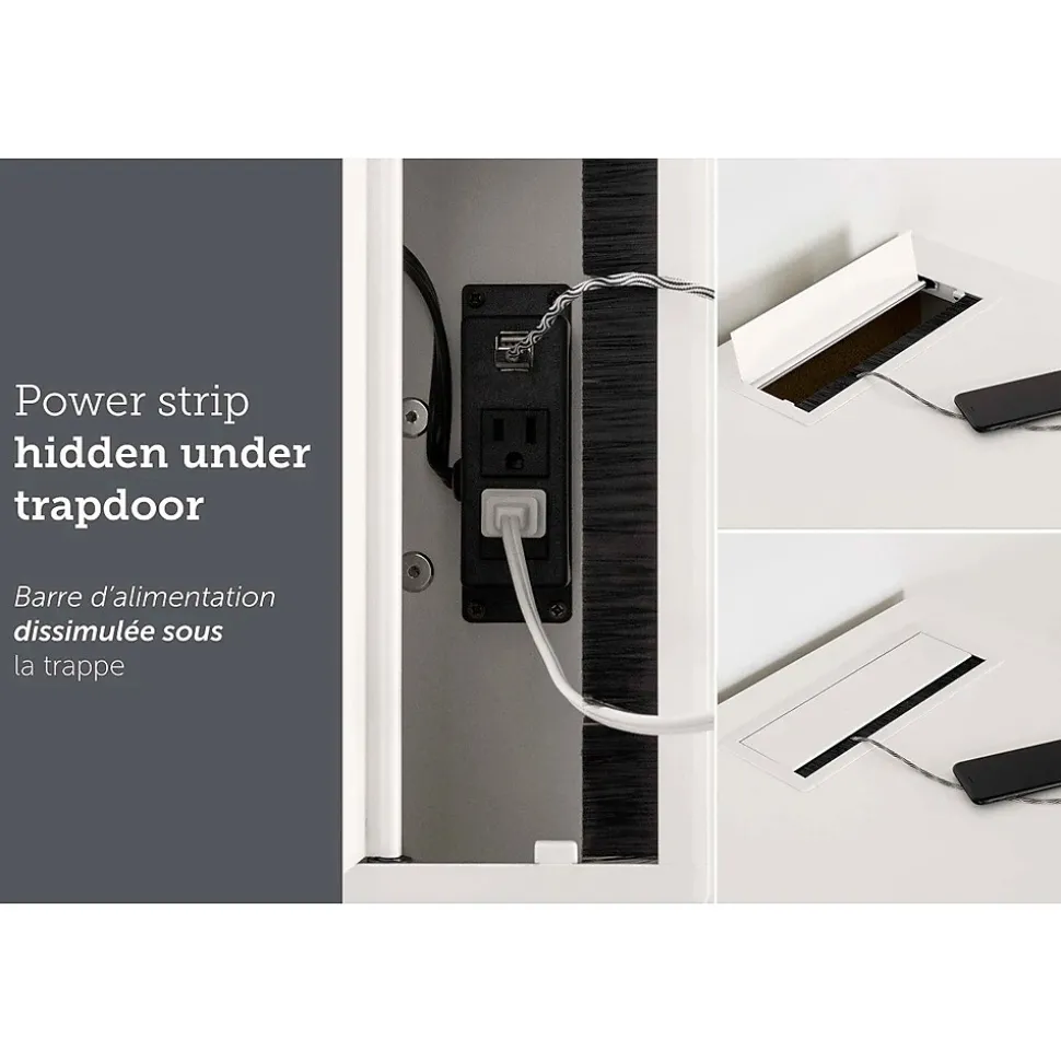 - Features a power strip built into the surface, hidden under a trapdoor for a cleaner look; the strip has two regular outlets and two USB ports, so you can keep your electronic devices plugged in while you continue to work