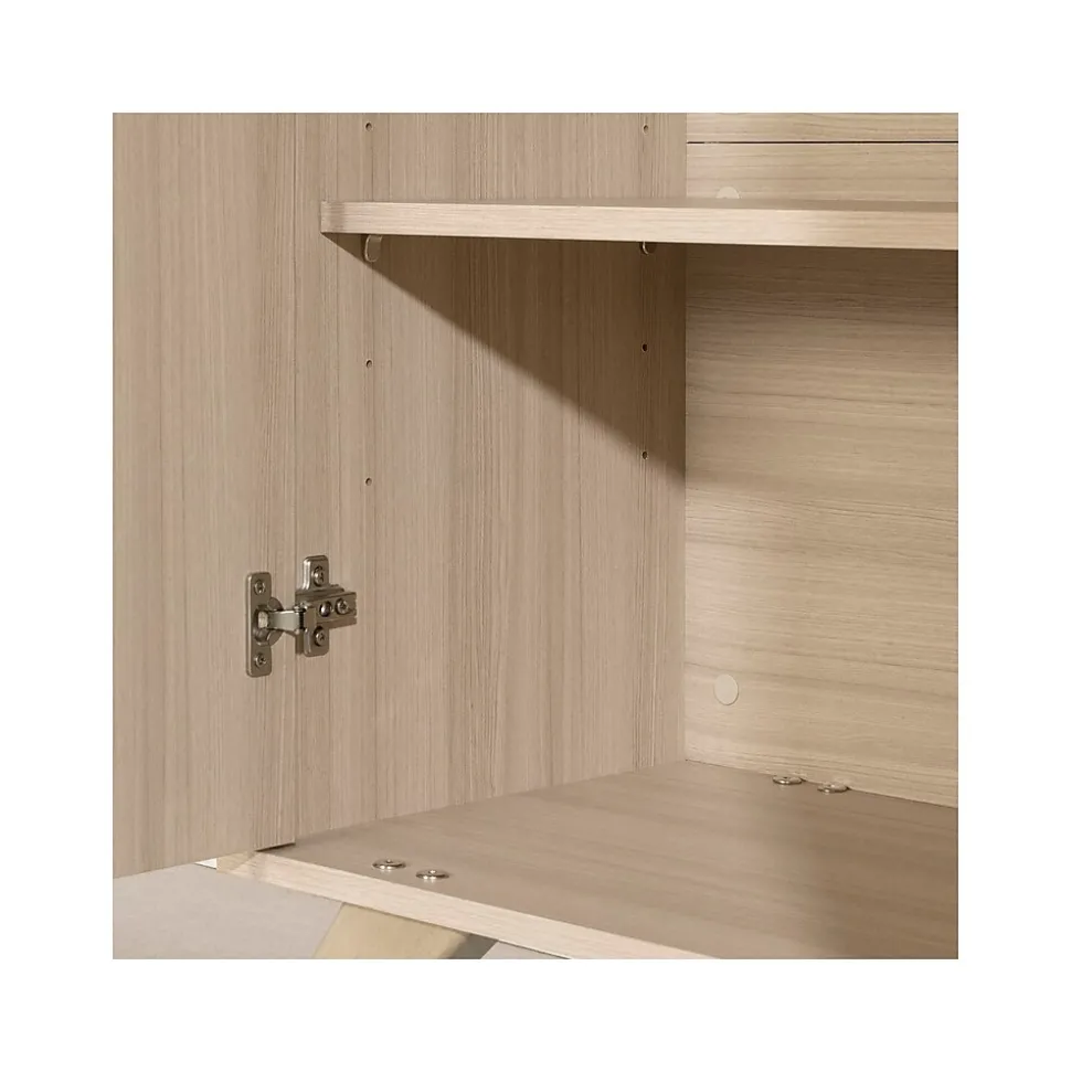 - Offers four open storage compartments and one removable shelf behind the doors