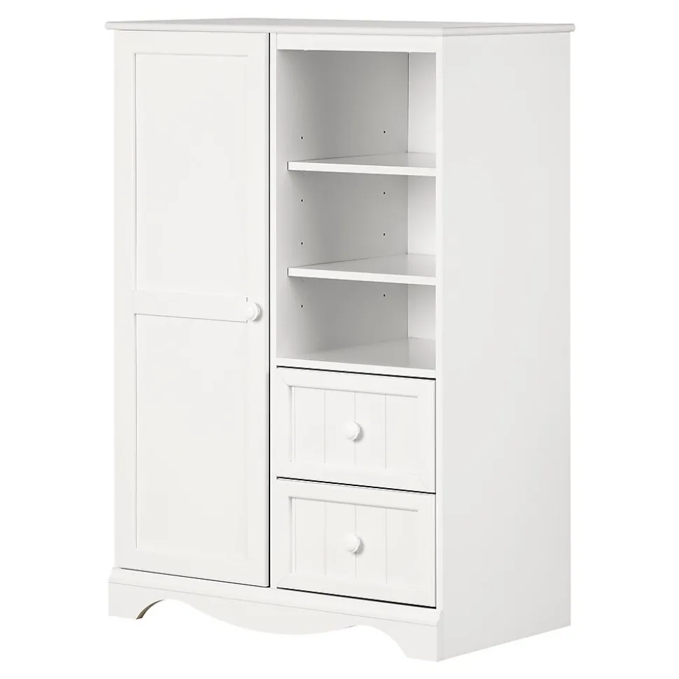 South Shore™ Savannah Particleboard armoire in pure white finish has finely worked wooden legs and antique brass finish metal handles that provide stylish look. Armoire features meticulously crafted details that help to keep items in place.