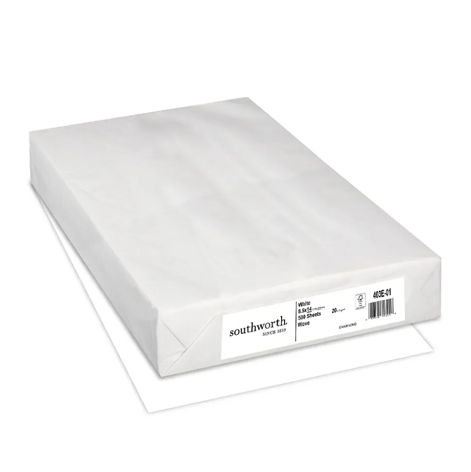 Print invitations, certificates, and other official papers with this white wove-finish business paper. Each sheet has a thick, high-quality look and feel thanks to the 20-pound paper stock and 25 percent cotton construction. This Southworth wove-finish business paper is legal size, making it ideal for use with a wide range of document formats.