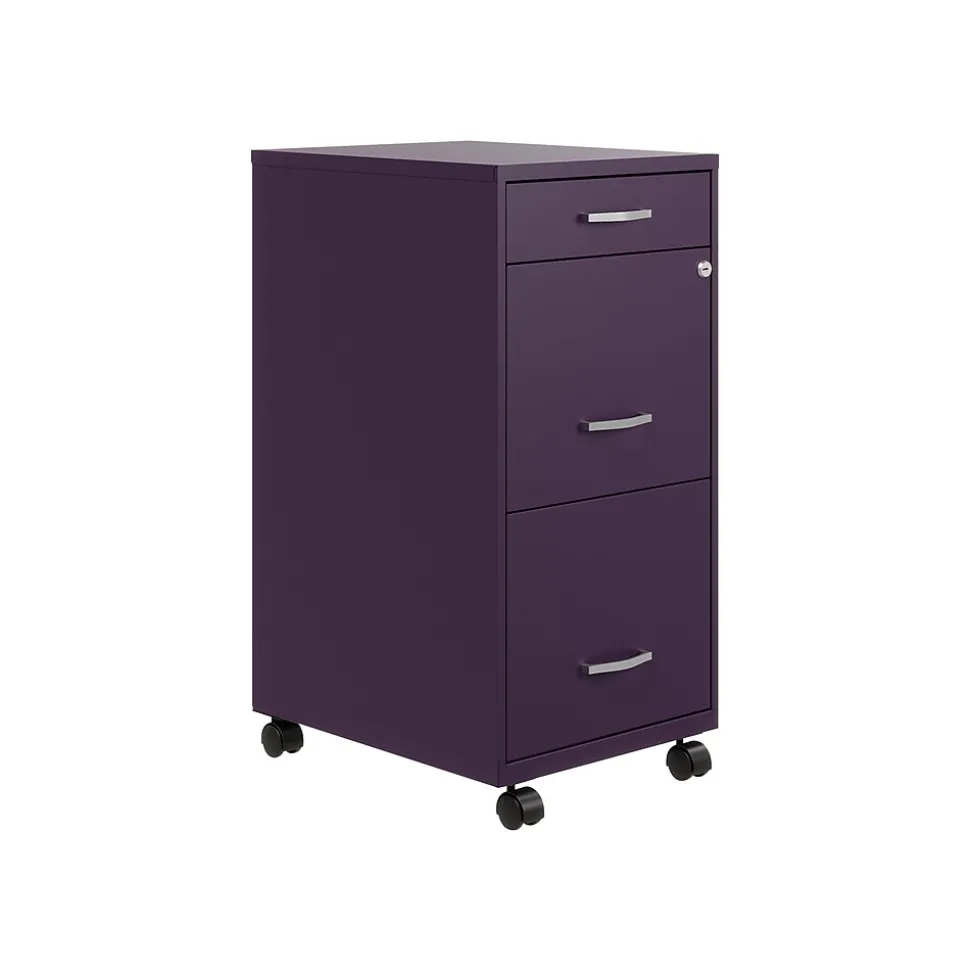 The Three Drawer Metal File Cabinet is a multi-functional storage solution perfect for files, office supplies, and accessories for your small professional office or home office. Featuring two file drawers and one storage drawer, this file cabinet features steel construction and a smart, efficient design. Our compact filing cabinet works well in small spaces and fits under most work surfaces or office desks. Each drawer features high-sides to accommodate letter-sized hanging files. The top accessory drawer is perfect for office storage and organization. The additional wheels that come with this file cabinet are both stylish and functional, making it easy to move around your home or office. Using a patented glide suspension, the drawers have a smooth open and close slide with a three-quarter drawer extension to prevent tipping. In addition, you can keep your files and possessions secure by using the built-in lock for the bottom two drawers. The painted steel surface is non-porous and easy to clean. Bring organization and function to your home or office with this three-drawer file cabinet.