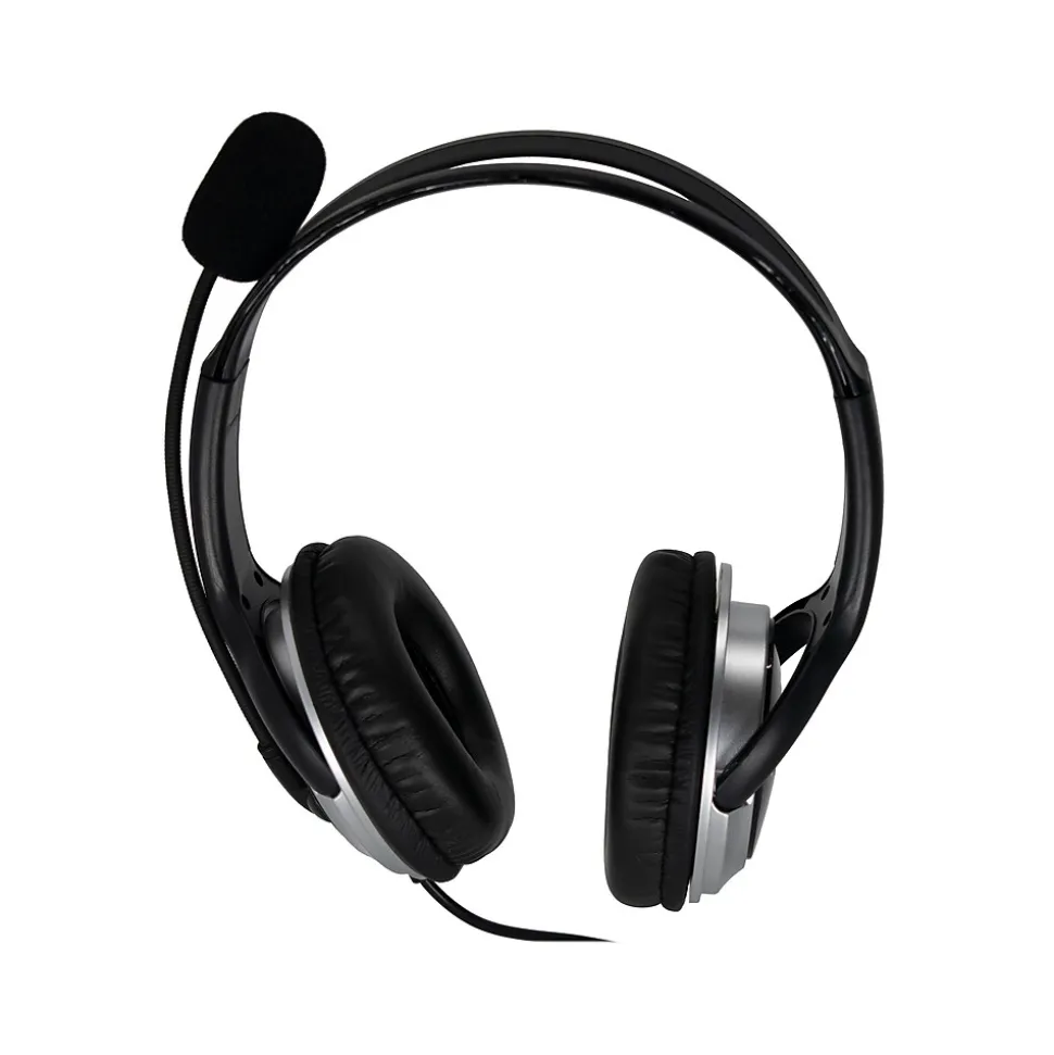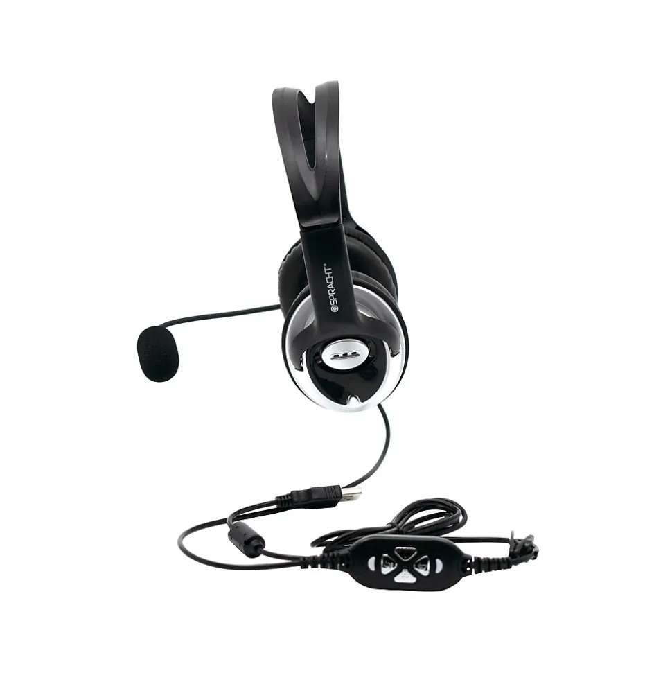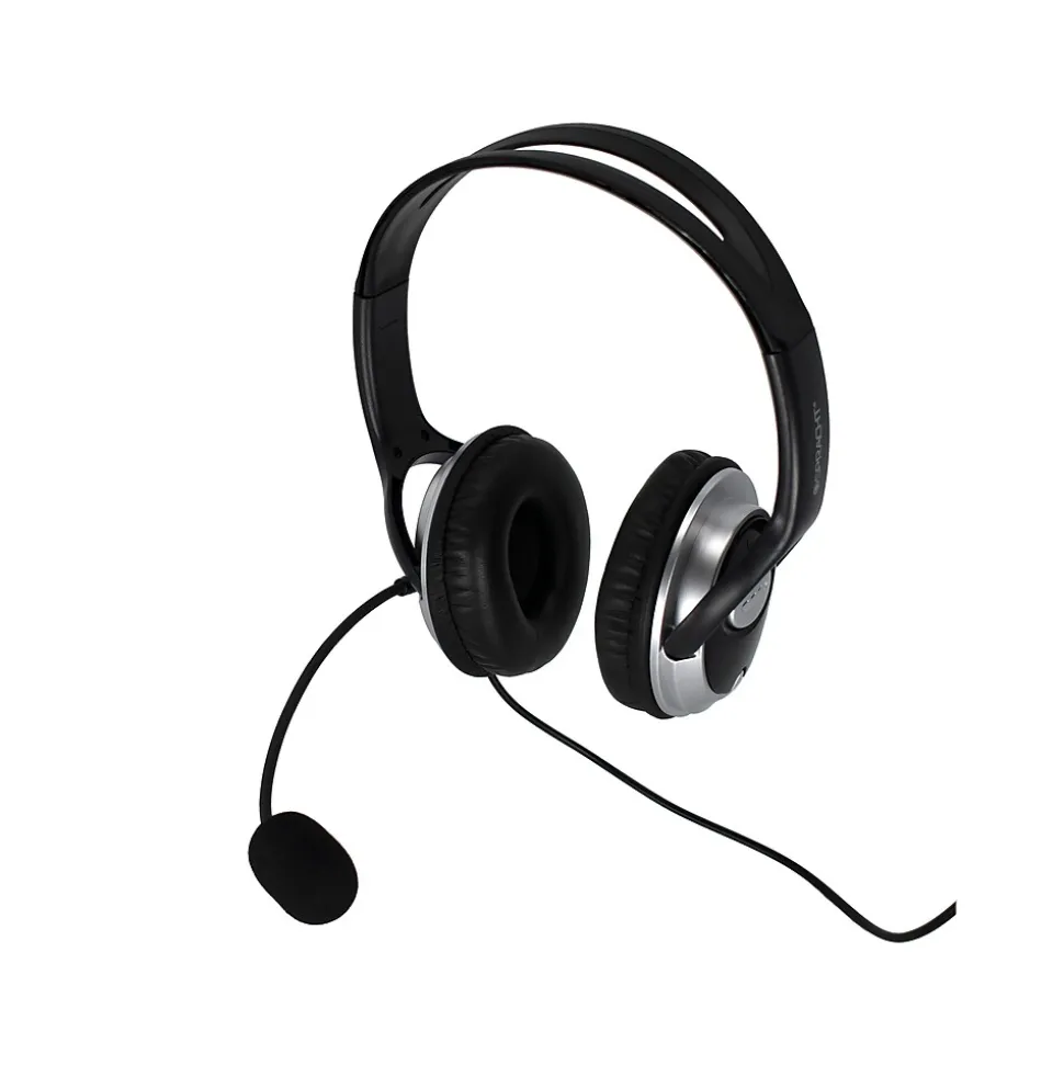 This Spracht headset provides noise cancellation for use in busy environments. Large leatherette-covered ear cushions mean comfort and durability. The mic boom is completely flexible, so you can adjust it for the best placement. The boom also rotates so that the mic and cord can be either on your right or left side. Designed for extensive use, the large speaker chambers cover most ear sizes comfortably. The in-line controller on the headset cord allows adjusting volume or muting the microphone or speakers.