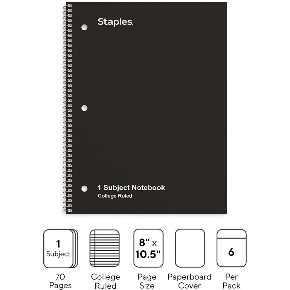 Stock up your supply closet with this 6-pack of 70-sheet notebooks. The spiral binding lets you seamlessly flip through the pages, and the college-ruled paper offers effective use of space and promotes clean writing. This TRU RED black 1-subject notebook features duplex cardstock cover for durability, and the 3-hole punched sheets are easy to insert into binders or manuals.
