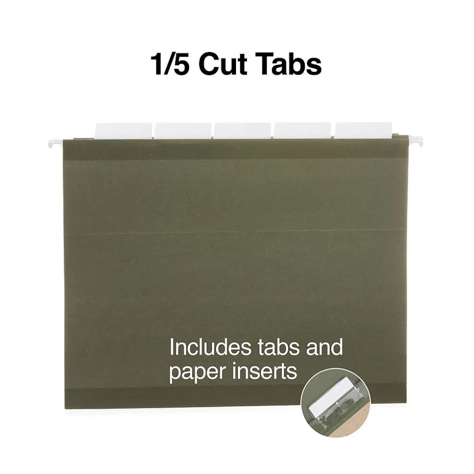 Bring a professional look to your file drawers with this hanging folder. Five tab positions make it easy to sort documents by date, name or account number, and the repositionable tab design lets you revamp your filing system as needed. This Staples letter-size standard green hanging file folder is perfectly sized to hold standard documents, providing a versatile choice for your busy office.