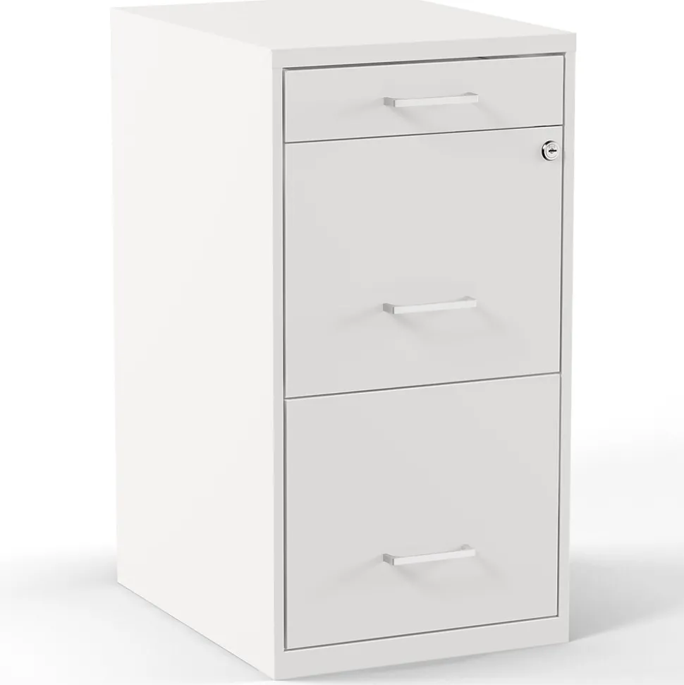 Get a space-efficient solution to recordkeeping and document storage with this three-drawer light duty vertical file cabinet. Ideal for organizing offices, the top drawer provides space for storing supplies, and the bottom two drawers accommodate a large number of letter-size files. The compact design lets this cabinet fit in small spaces, while the white finish and polished handles enhance office decor. This utility file cabinet keeps stored items secure with a built-in lock.