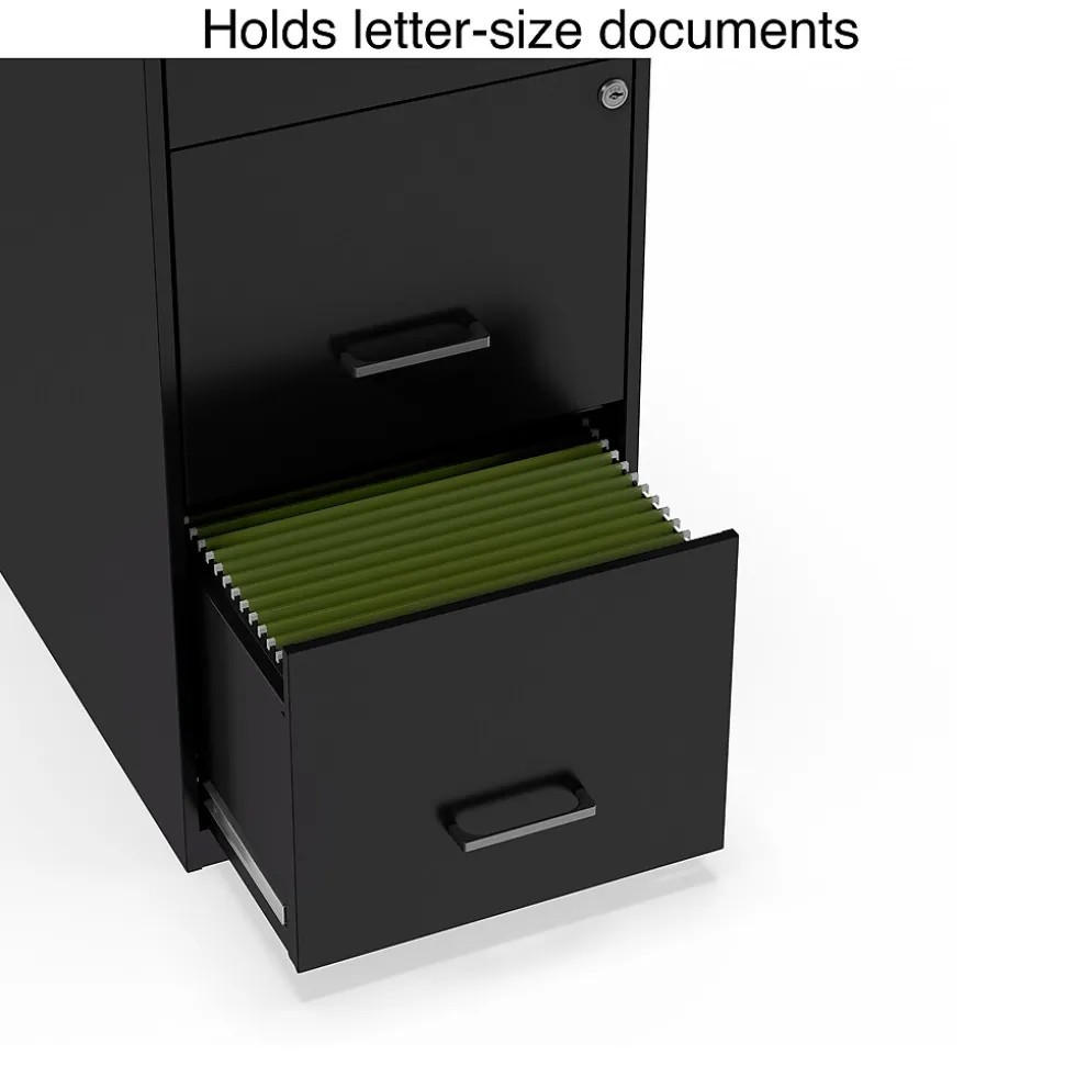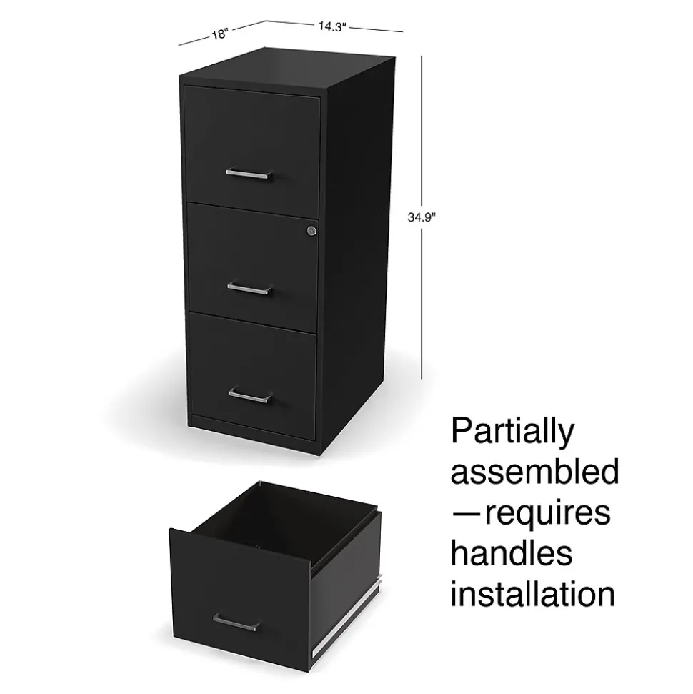 Keep important business records organized and close at hand with this three-drawer letter light duty vertical file cabinet. Ideal for workplaces of all sizes, this compact cabinet takes up minimal floor space and adds a contemporary touch to office decor with its sleek black finish and polished handles. The three deep drawers accommodate large numbers of letter-sized files and make it easy to organize office paperwork. This Staples letter vertical file cabinet keeps stored documents secure with a built-in lock.