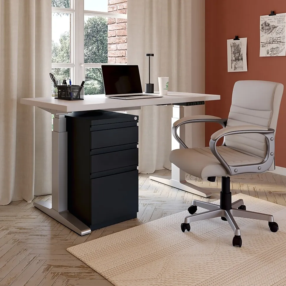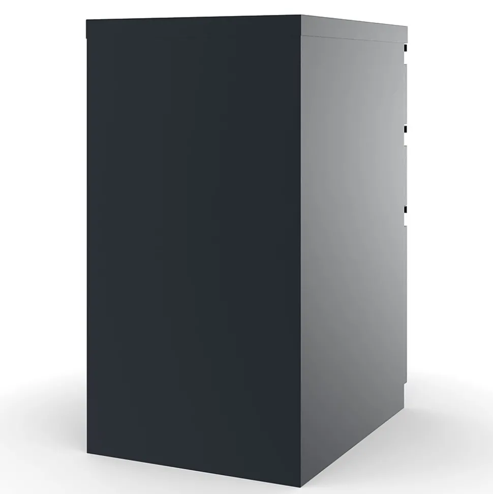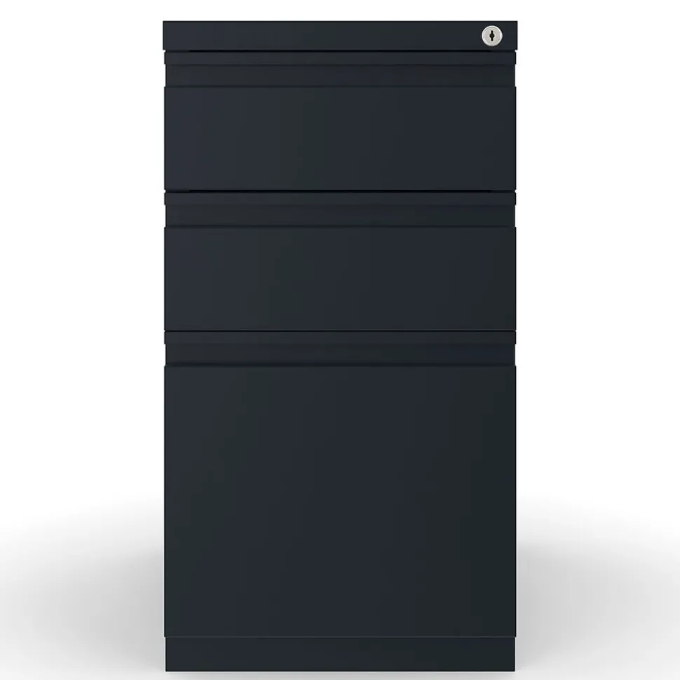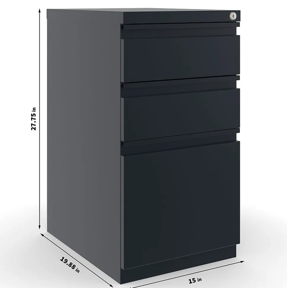 Keep your work area neatly organized with this three-drawer file cabinet. The two box drawers provide storage for small office supplies or personal items, while the file drawer holds hanging folders to keep documents upright and easily accessible. A keyed lock system lets you restrict access to important paperwork whenever you step away from your desk. This mobile pedestal file cabinet features hidden casters, making it easy to roll it across your office floors.