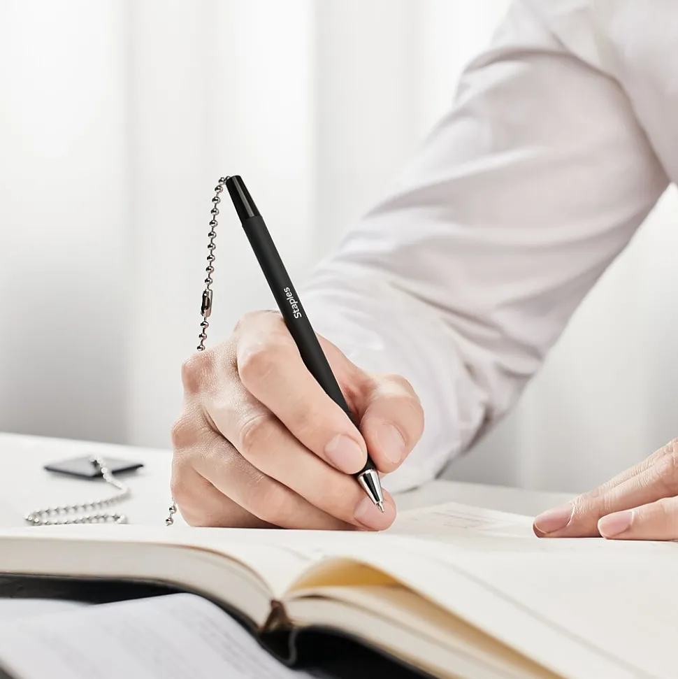 Ensure customers don’t accidentally walk off with your pen by using this black anchor pen. The base is coated with a strong adhesive that sticks to any clean, flat surface, while the 24-inch chain offers plenty of slack for writing comfortably. This Staples Anchor medium-point black anchor pen has a 1.0mm tip that lets you create smooth, bold lines.