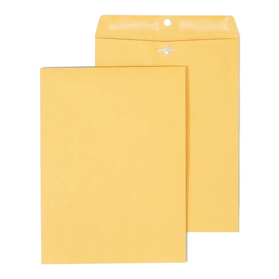 Protect important documents with Staples kraft clasp envelopes. These 9 x 12-inch envelopes fit letter-size documents, making them ideal for transporting applications, contracts and business statements. Each envelope in this 12-pack features a heavily gummed seal and clasp closure, letting you securely seal confidential documents or close with the reusable metal clasp. These Staples kraft clasp envelopes are made from 28-pound kraft paper and are durable for mailing or reusing around the office.