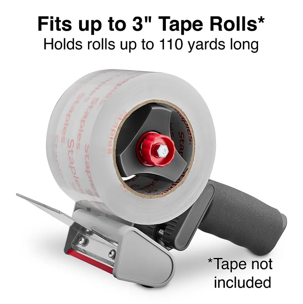 Seal cartons efficiently with this comfortable Staples packing tape dispenser. The soft handle covering allows you to process bulk applications while reducing hand fatigue. This 2-inch dispenser features a non-stick tape guide that helps prevent tape from sticking to the dispenser and reduces residue build up.