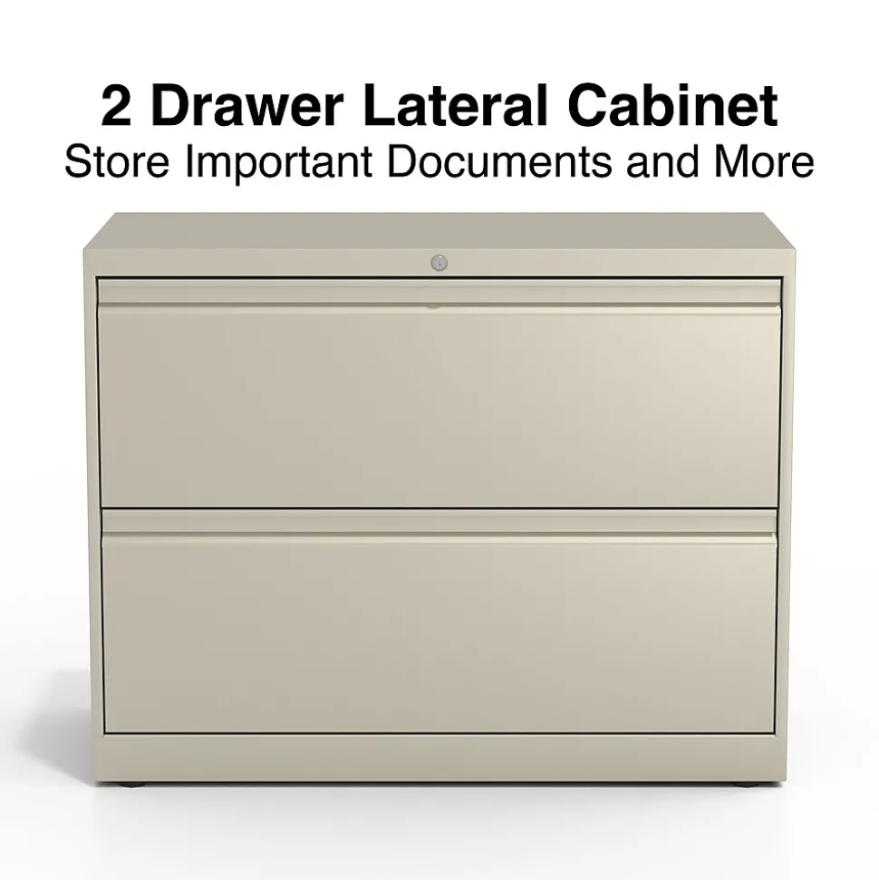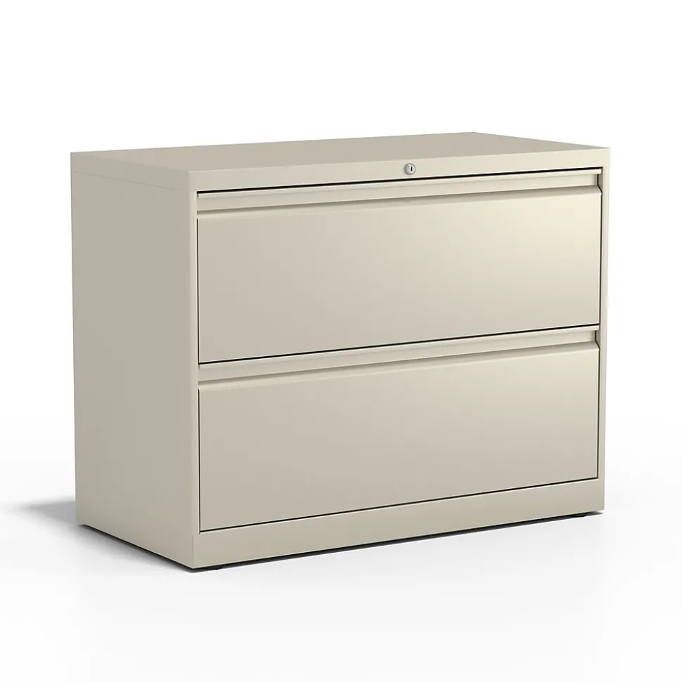 - Two-drawer lateral filing cabinet holds letter or legal size documents