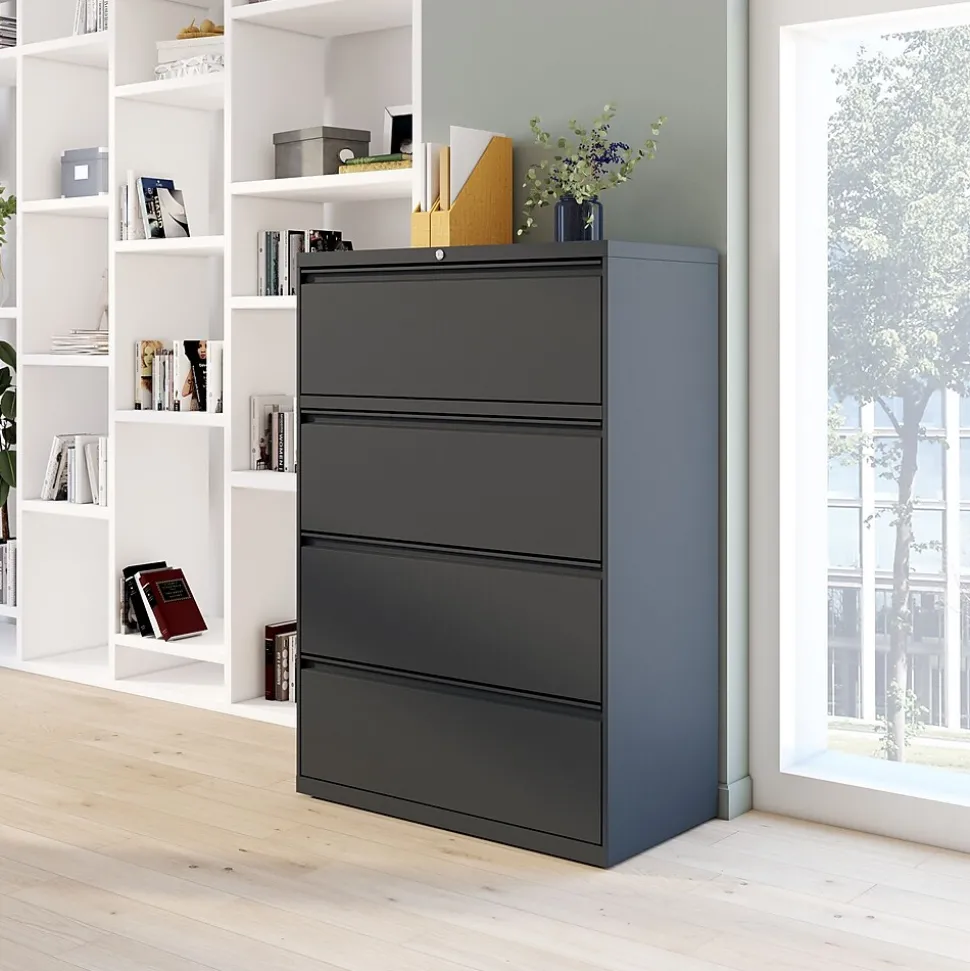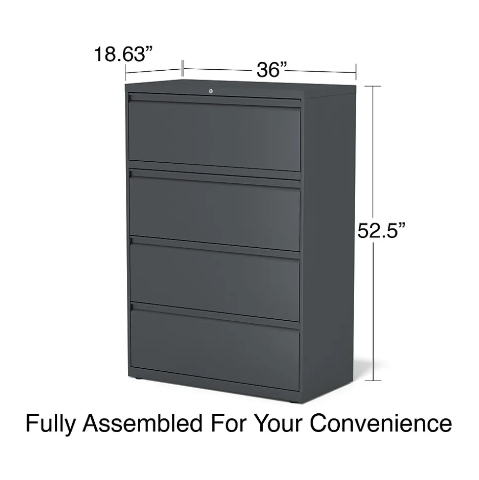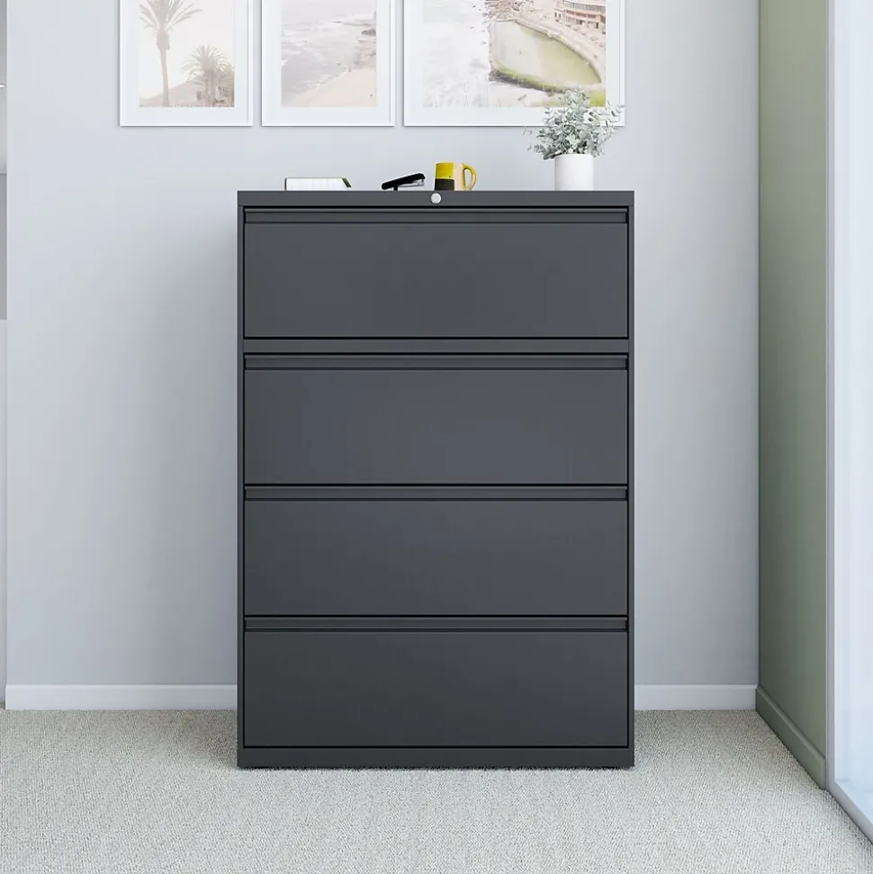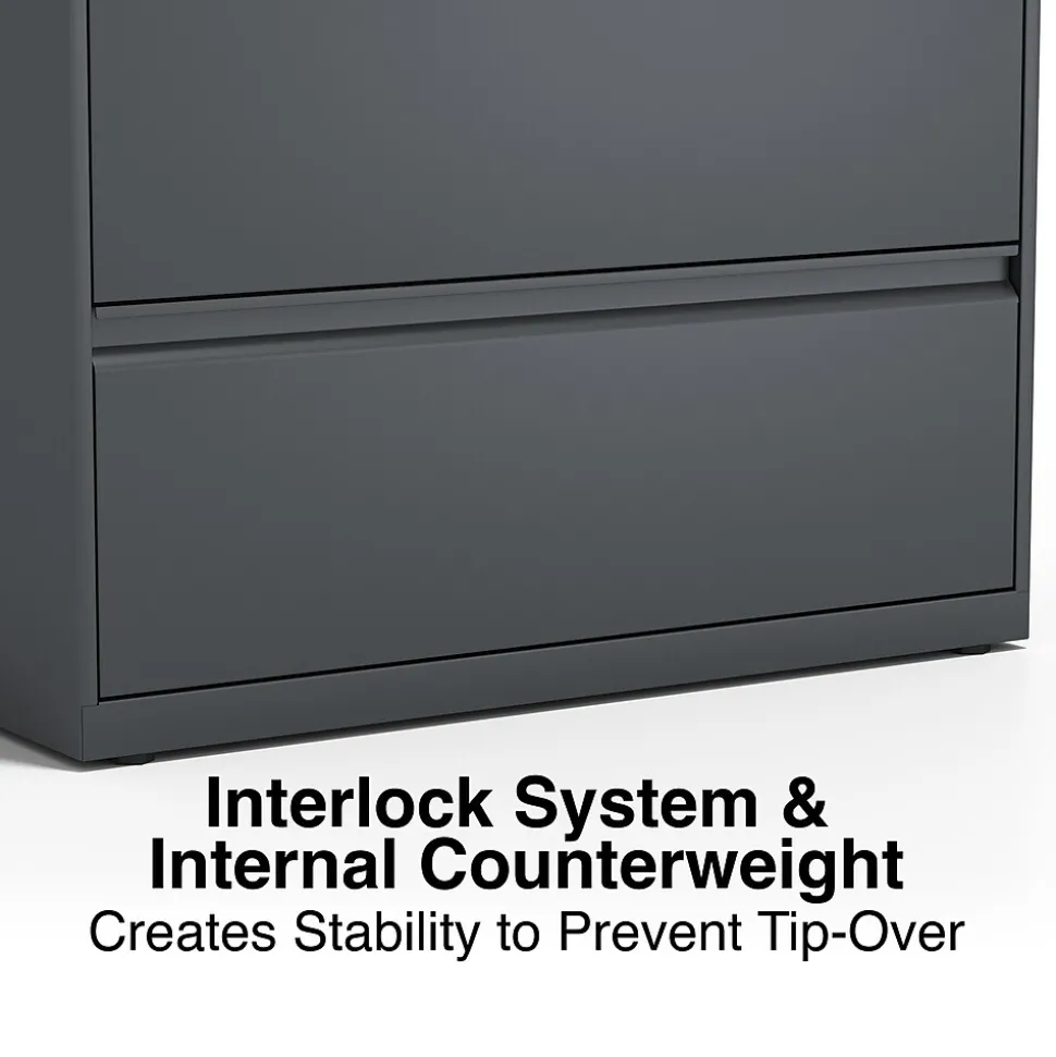 Keep paperwork organized inside this four-drawer file cabinet. Precision steel ball-bearing glides deliver smooth opening and closing, while the interlock system only allows one drawer to open at a time for added safety. Each drawer accepts letter, legal and A4 documents, providing flexible file storage options, and a core removable lock system makes it easy to keep sensitive information secure. This charcoal lateral file cabinet boasts adjustable hang rails to accommodate hanging file folders.