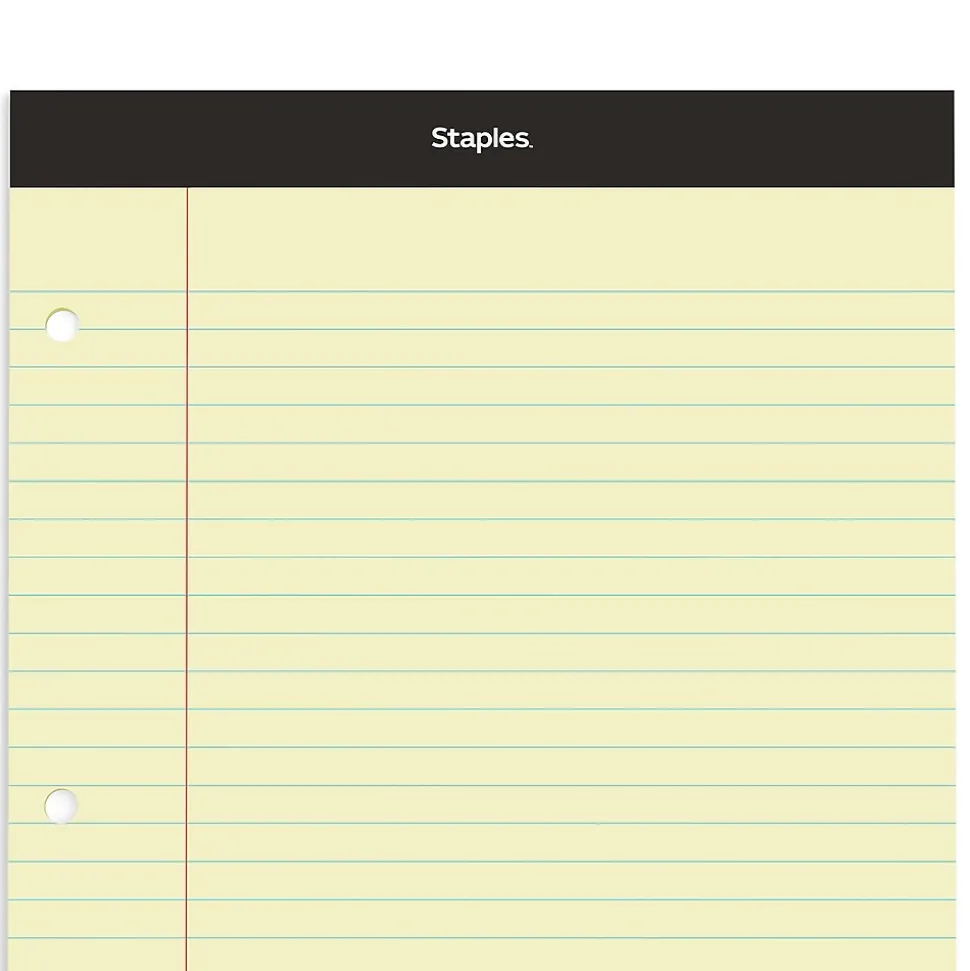 Make sure notes are easy to read when you use this canary double-sheet notepad. Each sheet employs wide-ruled spacing that lets you use large, clear lettering, while the canary coloring ensures writing stands out for high readability. This Staples wide-ruled canary double-sheet notepad has double the sheets of regular notepads to meet hefty note-taking needs, and the three-hole punched edges work with standard three-ring binders.