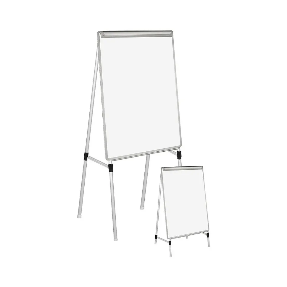 Present notes, sketches and other memorable items with this dry-erase quad-pod presentation easel. Created with versatility in mind, this easel features adjustable legs so it can stand on its own or fit easily on a tabletop. The dry-erase surface lets you write or draw custom content before wiping cleanly away, or use the no-pinch clip to secure drafting pages and paper pads to this presentation board. The included full-length aluminum tray provides a convenient place to rest markers and erasers. This quad-pod presentation easel is lightweight and folds for simple storage and transportation.