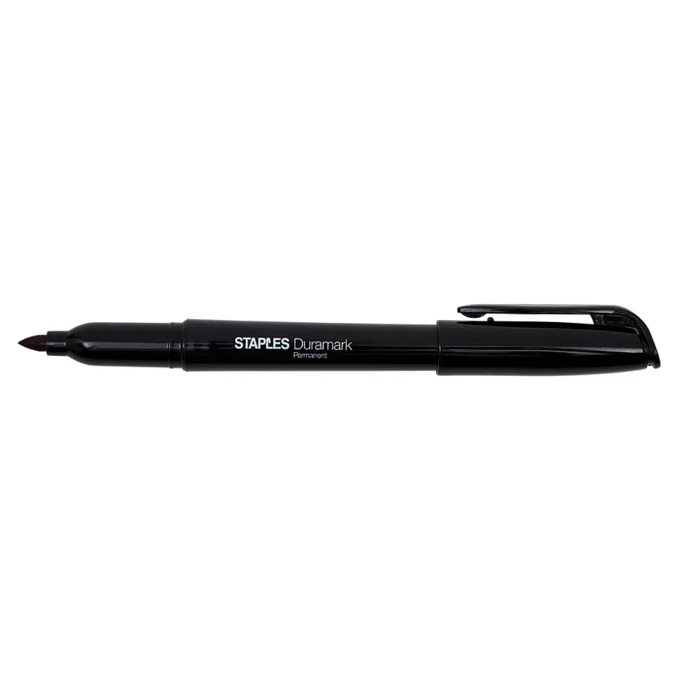 Create bold, precise lines with Staples Duramark fine-point permanent markers. Each marker in this 12-pack features a fine-point tip, ideal for filling in smaller labels or name tags. The black ink resists fading and can be used on most surfaces, making Staples Duramark fine-point permanent markers perfect for a variety of tasks at home or in the office.