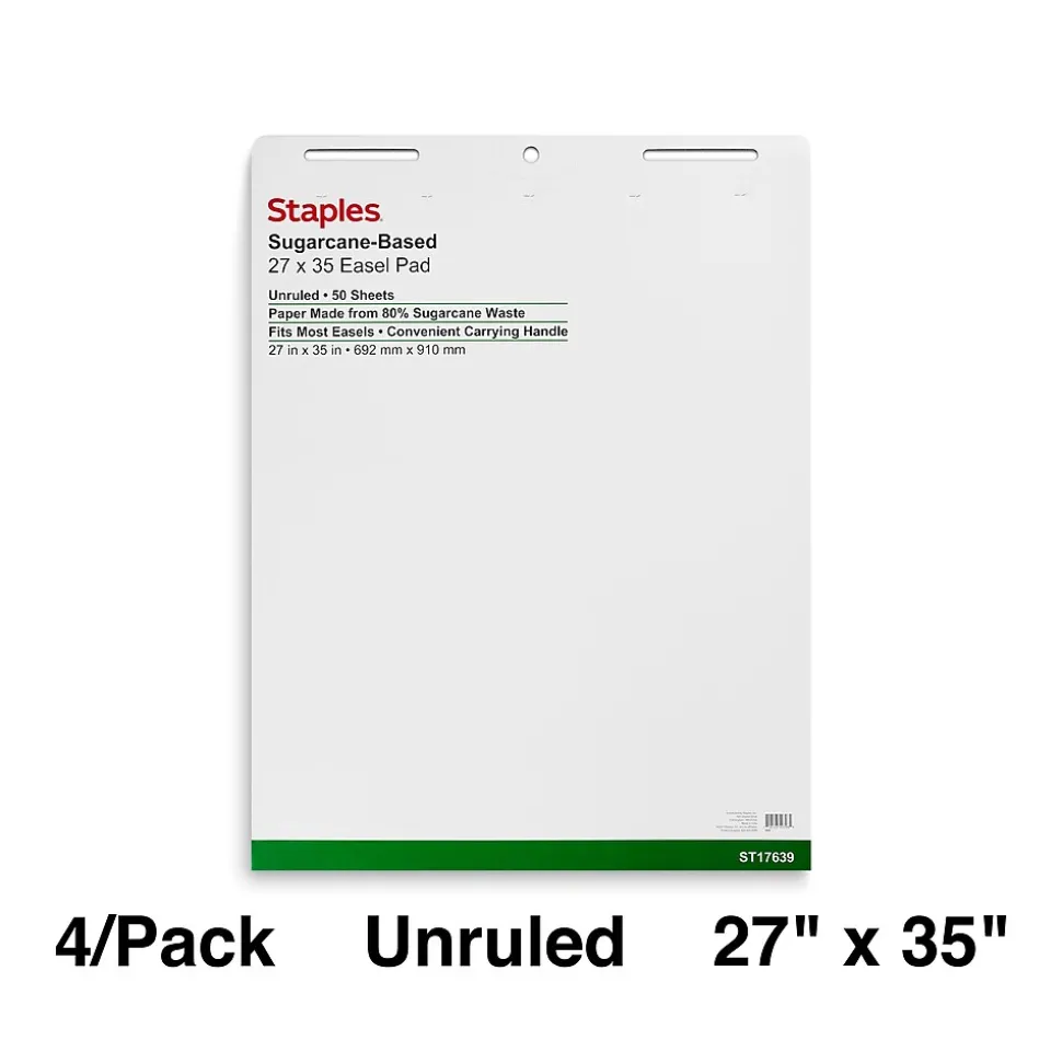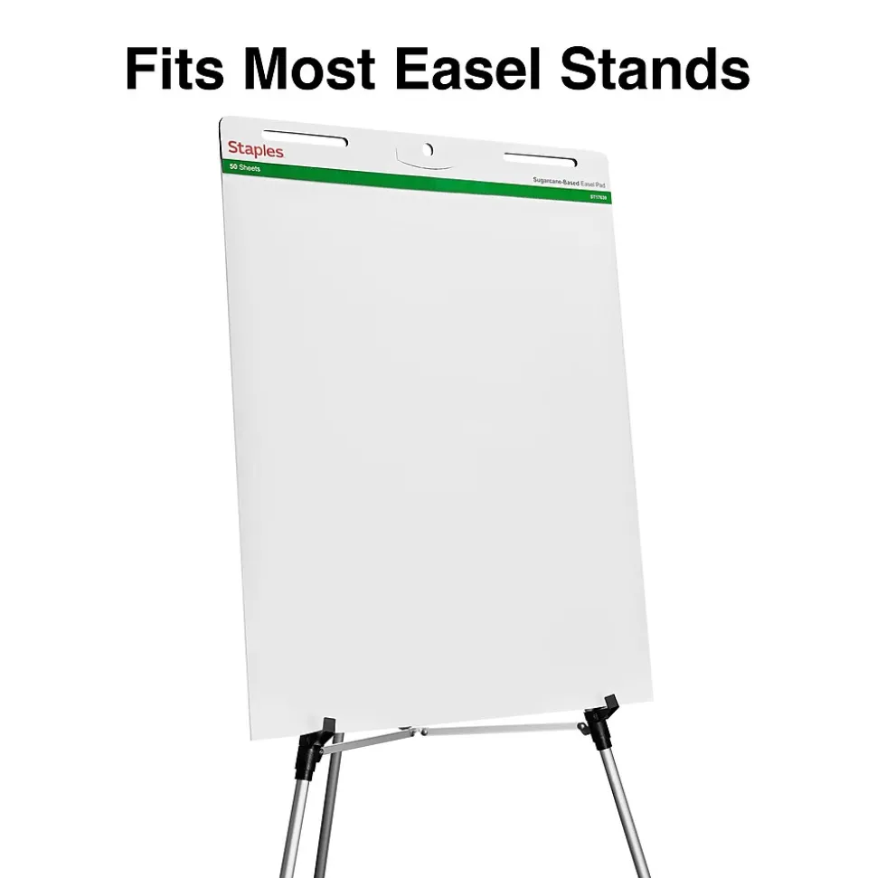 Jot down ideas or draw out plans with these white easel pads. The large pages are easy to see, making them ideal for use in group settings. Smooth pages allow for a more enjoyable writing experience, and the pinhole perforations prevent pages from slipping out of the binding. Crafted from 80 percent sugarcane waste, these Staples easel pads offer a sustainable paper option for your needs.