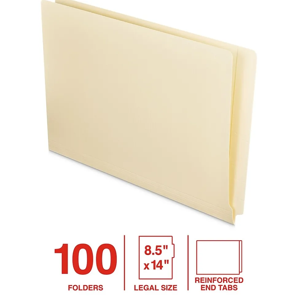 Our premium end tab file folders will give you everything you need to organize and declutter your workspace. These folders are made for legal-size documents and crafted from durable material for long-lasting use. Each folder has embossed lines for easier labeling so you’ll be able to quickly identify your files. The reinforced tabs add a little extra strength and durability, so these folders can be used and re-used frequently. You’ll get 100 folders in each pack, so there will be plenty of help to tackle all your projects or filing tasks. Made from standard-duty 11 pt stock and packaged in an eco-friendly chipboard box with a color label, they’re a great choice for your home or office organization needs.